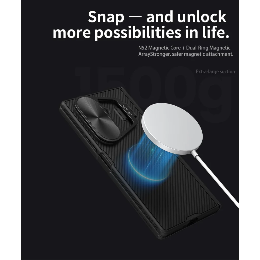 A Nillkin CamShield Prop Mágneses egy egyedülálló hátlap, amely felhajtható kamera lencsevédő burkolattal és integrált mágnessel rendelkezik.