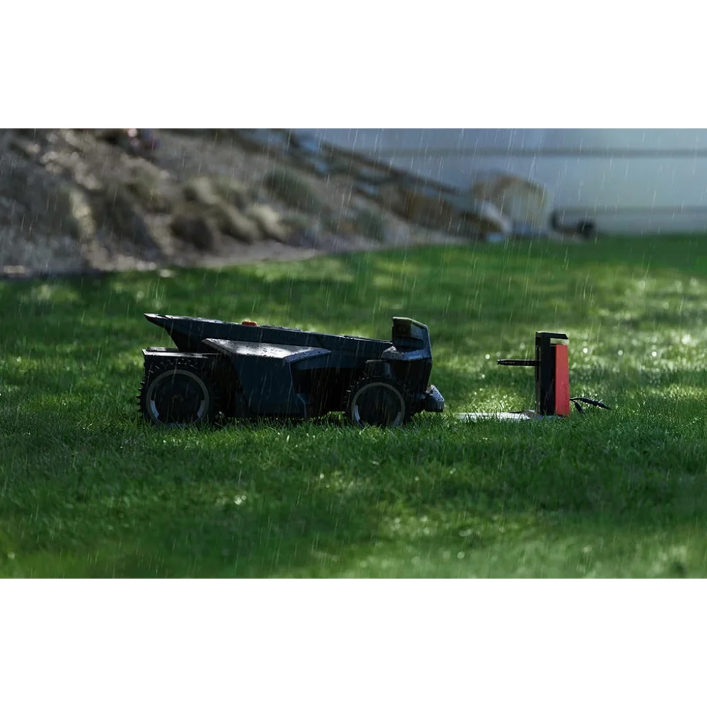 Az IP66 védettségű ház megóvja az alkatrészeket a víztől és a portól, a kialakítás pedig lehetővé teszi a nyomás alatti tisztítást is. A zajszint 68 dB(A), így a robot a környezet zavarása nélkül képes dolgozni. A beépített esőérzékelő és az időjárás-előrejelzéshez igazított ütemezés biztosítja, hogy eső esetén a robot automatikusan visszatérjen a bázisállomásra.