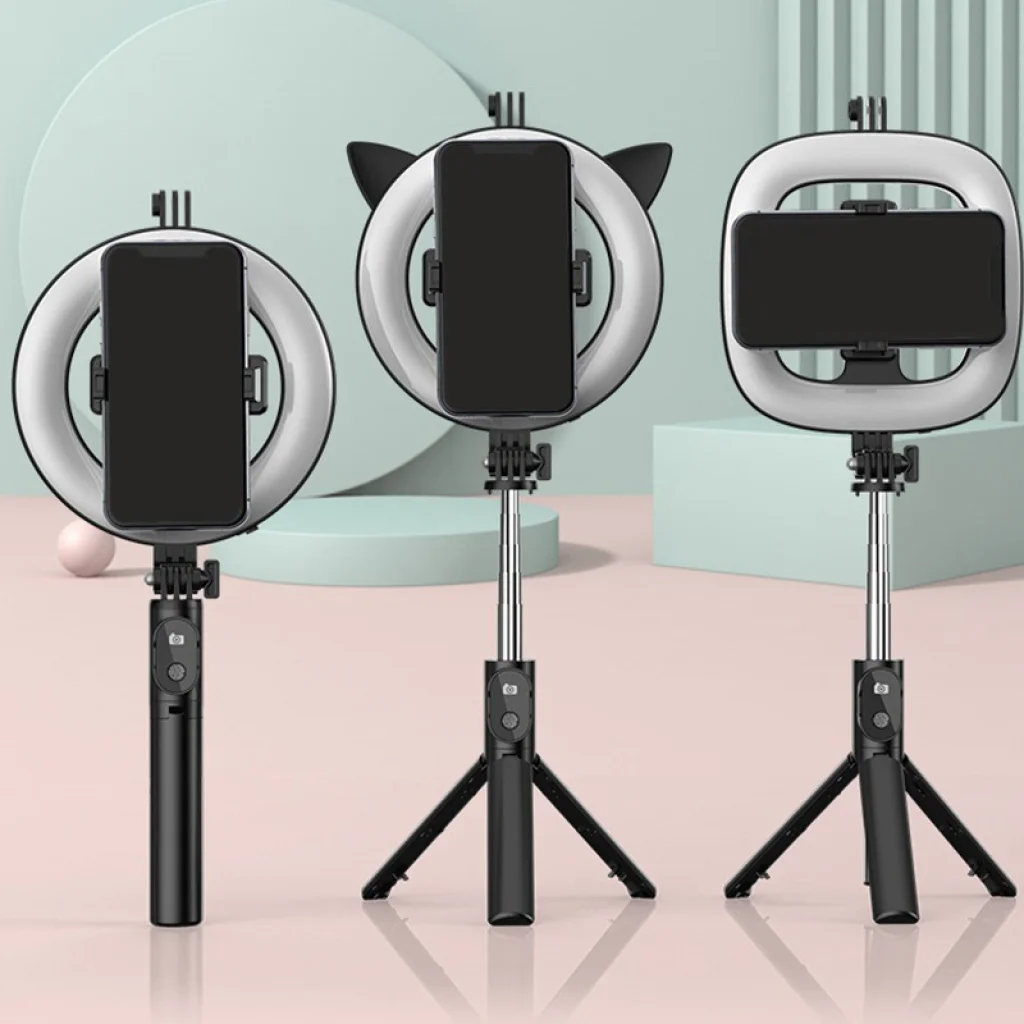 - A selfie tartó állítható állványra van szerelve, amely lehetővé teszi a magasság szükség szerinti beállítását.