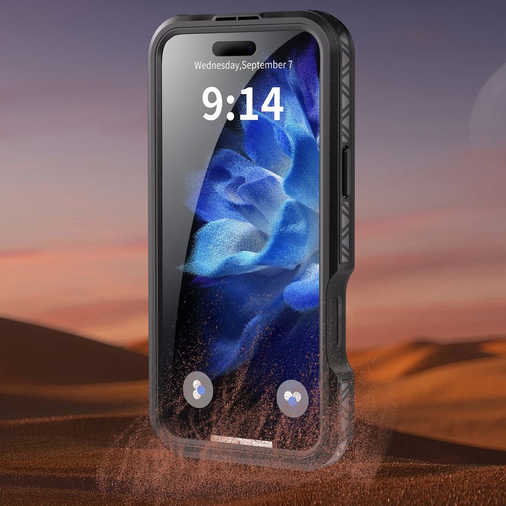 A SHELLBOX GT tok IP68 tanúsítvánnyal rendelkezik, ami garantálja a teljes porállóságot és a vízbe merülés elleni védelmet. Akár 1,5 méter mélységig, akár 30 percen keresztül is ellenáll a víznek. Legyen szó esőről, sárról, homokról (ahogy a sivatagi környezetben készült képen is látható) vagy rövid vízzel való érintkezésről, ez a tok megbízhatóan védi készülékét a legzordabb környezetben is.