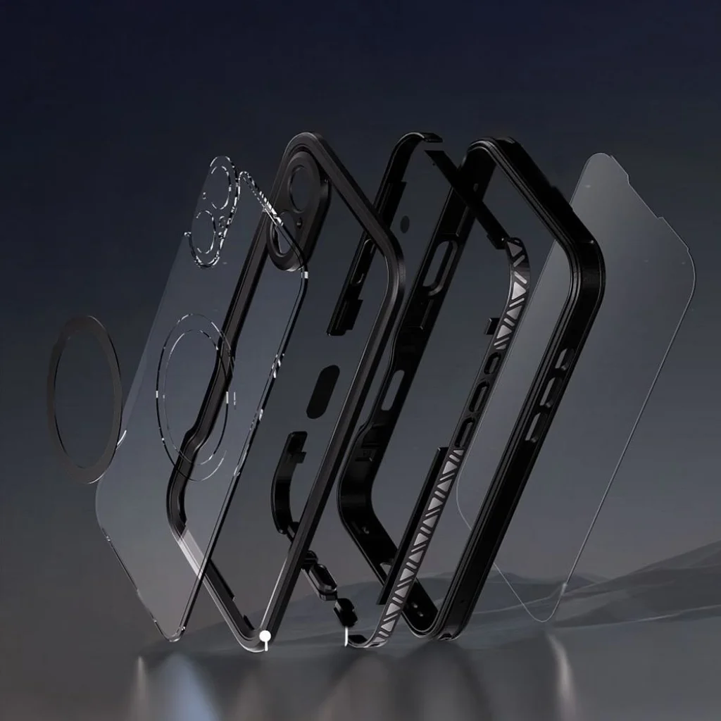 A tok egy egyedi, beépített tömítéssel ellátott zárral rendelkezik, amely hermetikusan zárja a készüléket, minimalizálva a víz bejutásának kockázatát. Az összetett, többrétegű szerkezet – melyet az „exploded view” képen is megfigyelhet – biztosítja a 360 fokos védelmet, magában foglalva a kijelző és a hátlap teljes befedését, valamint a kamera lencséinek védelmét is, így készüléke minden irányból védett lesz.