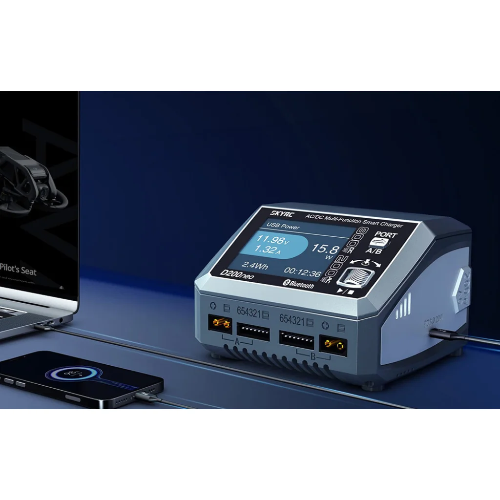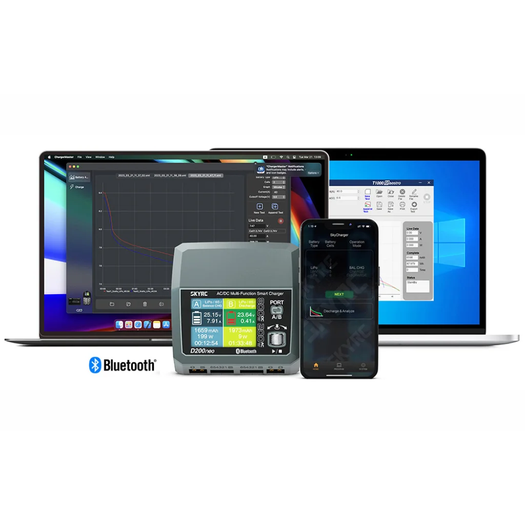 A D200neo USB-C-n keresztül PC-hez vagy Mac számítógéphez csatlakoztatva lehetővé teszi a SkyRC Charger Master alkalmazáson keresztül történő felügyeletet és vezérlést. A töltőt OTA-frissítésként is frissítheti, és a legújabb szoftvert valós időben szinkronizálhatja egy dedikált felhőbe. A töltési és kisütési adatok elemezhetők és grafikonon megjeleníthetők. A kezelőfelület jelenleg angol, holland, kínai, francia és japán nyelven érhető el. A felhasználók egyszerű kattintásokkal könnyen megváltoztathatják, így a SkyRC használata még kényelmesebbé válik.