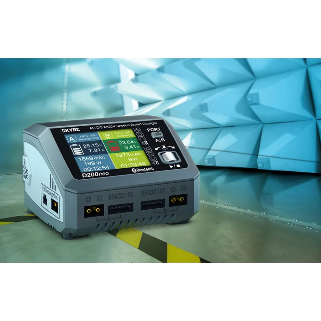 A SkyRC készülék két, egymástól függetlenül működő porttal rendelkezik, amelyek két akkumulátor hatékony és egyidejű töltését biztosítják. Mi több, a D200neo rugalmasan választhat az AC és DC bemenet között, alkalmazkodva a különböző forgatókönyvekhez. AC üzemmódban akár 200 W töltési teljesítményt biztosít, míg DC üzemmódban a teljesítmény 800 W-ra nő. Ezenkívül a legnagyobb hatékonyság érdekében választhatja a 800 W-os egyenáramú töltést, vagy a 200 W-os váltakozó áramú töltést, hogy teljesítményét az Ön egyedi igényeihez igazítsa. A D200neo egy abszolút forradalom az RC töltők világában.