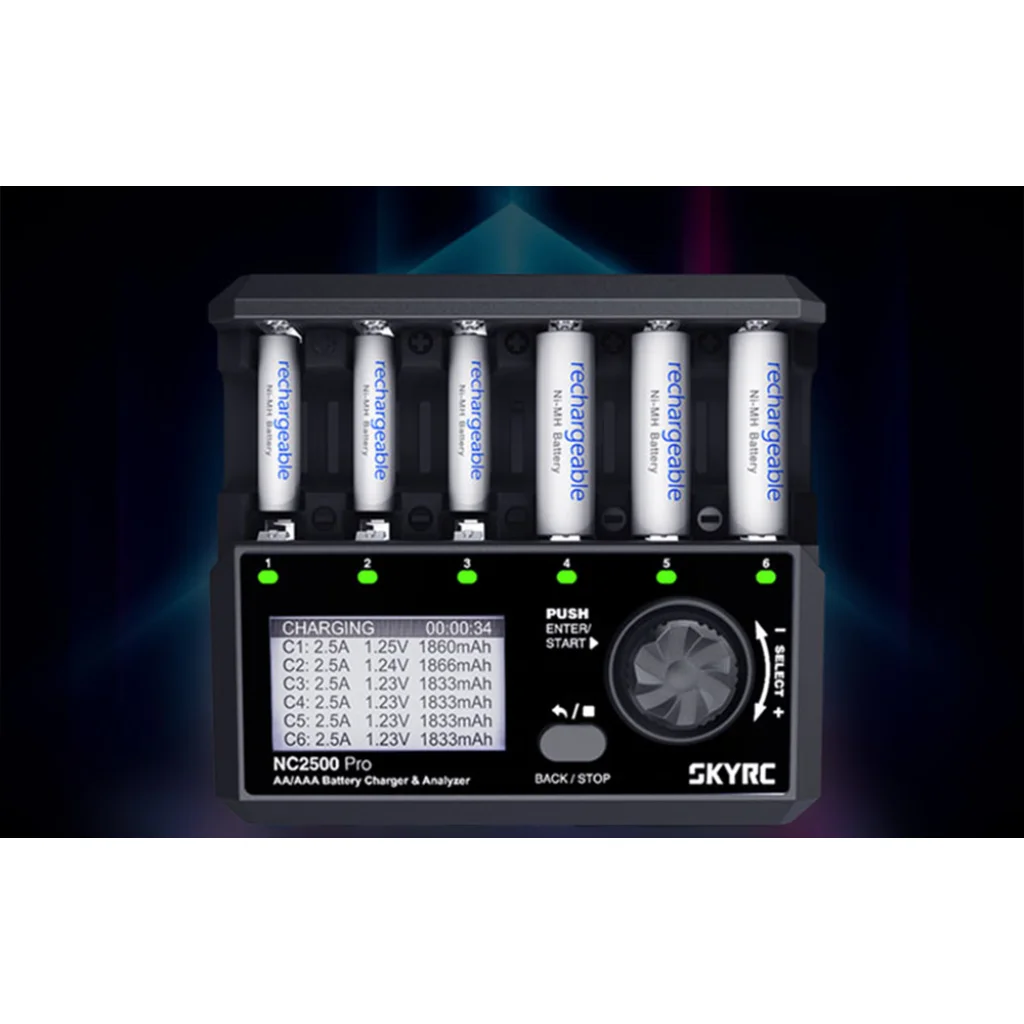A SkyRC NC2500 Pro töltő nemcsak AA és AAA akkumulátorok töltését teszi lehetővé, hanem azok regenerálását is. A készülék többféle üzemmódot kínál, és további előnye a bejáratási funkció, amely lehetővé teszi a régóta nem használt modellmotorok bejáratását. Van egy USB-portja is, amely támogatja a QC 3.0 gyorstöltést, és a töltő 6 akkumulátorhellyel rendelkezik.