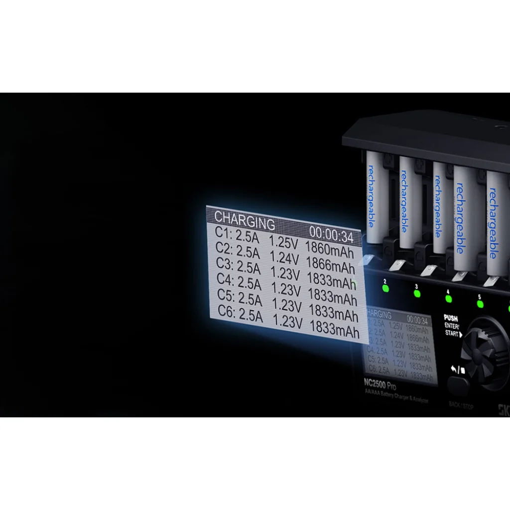 Az NC2500 Pro-val akár 6 akkumulátort is tölthet egyszerre. A készülék 6 slottal van felszerelve, és 2,5 A maximális áramerősséget kínál. A töltő speciális Step Charging módot is kínál, amely lehetővé teszi az áramerősség beállítását az egymást követő töltési lépésekhez. Így még jobban vigyázhat akkumulátorai állapotára és élvezheti azok optimális teljesítményét!