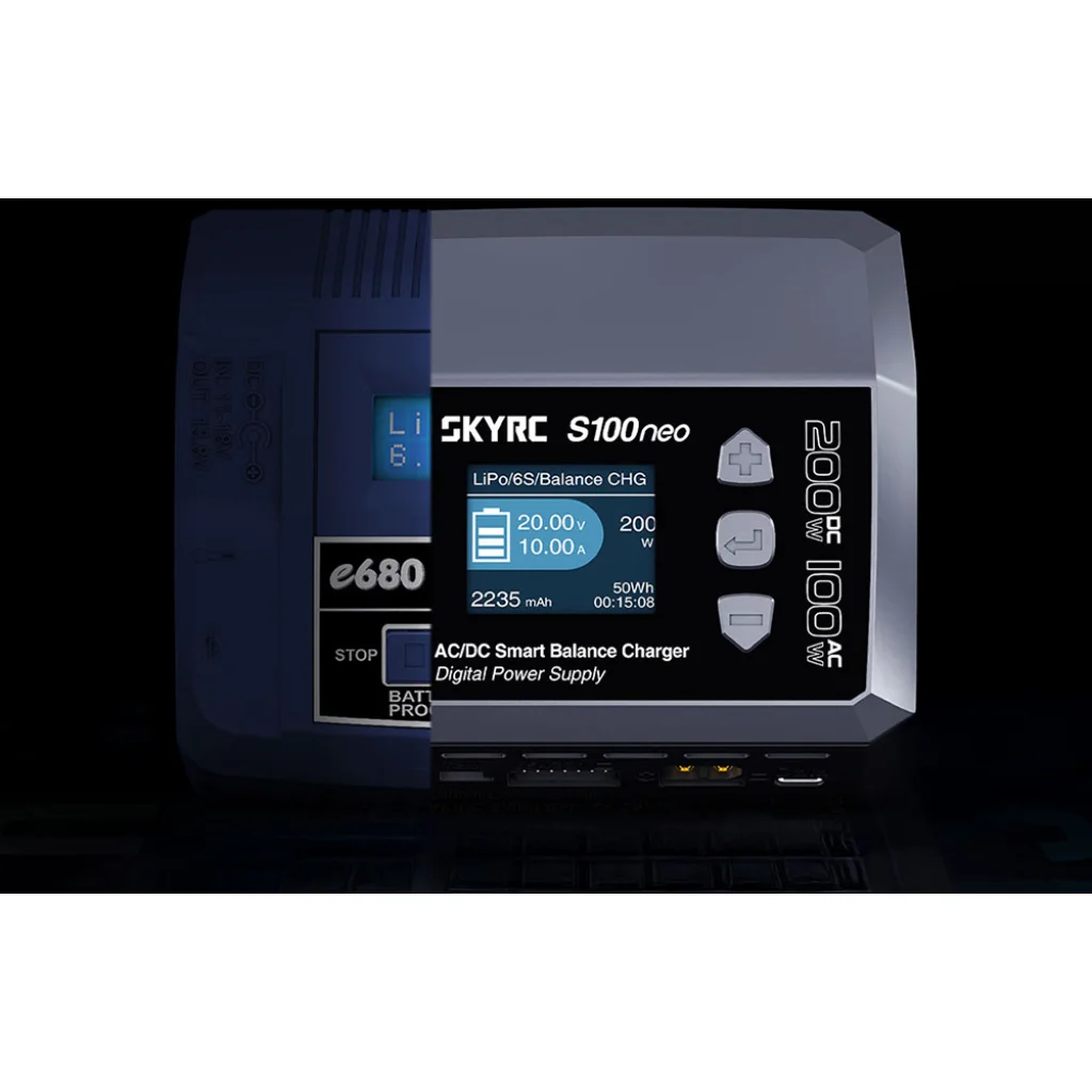 A SkyRC S100neo hálózati árammal és külső egyenáramú tápegységgel egyaránt működik. Váltakozó áramú üzemmódban a maximális töltési teljesítmény 100 W, míg egyenáramú tápellátás esetén 200 W-ra nő. Ezáltal a töltő otthoni és terepi használatra egyaránt alkalmas, ahol gyakran használnak akkumulátoros vagy műhelyi tápegységeket.