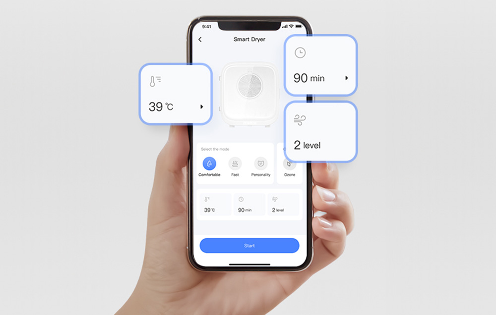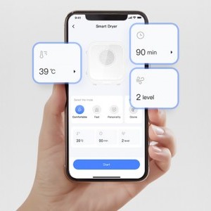 A szárítót egyszerűen vezérelheted okostelefonodon keresztül Bluetooth-on keresztül csatlakozva. A dedikált alkalmazás lehetővé teszi a hőmérséklet beállítását (16-40°C), a szárítási idő és üzemmód kiválasztását, valamint a légáramlás szabályozását. Így minden fontos funkció mindig kéznél van!