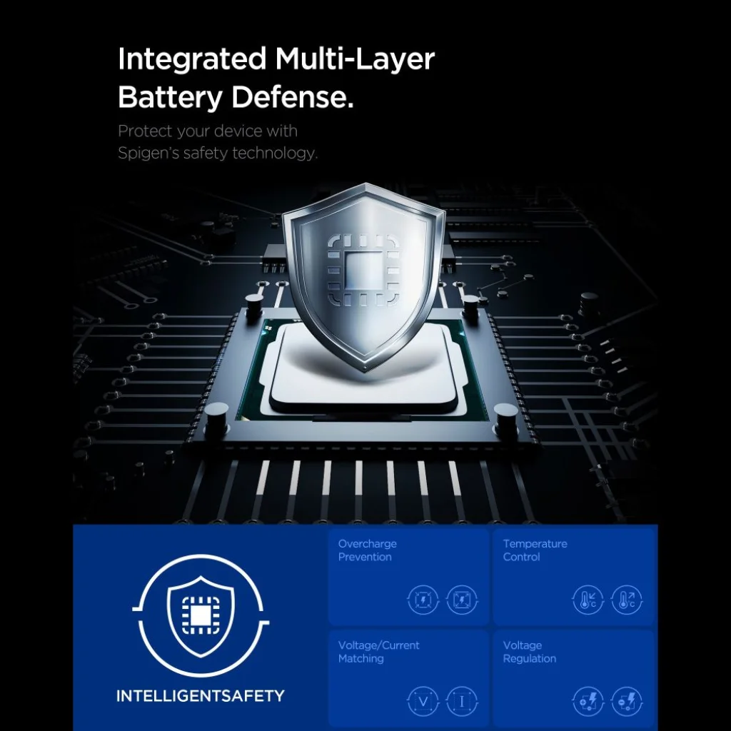 A töltő nemcsak gyors, hanem rendkívül biztonságos is. Az IntelligentSafety rendszer integrált, többrétegű akkumulátorvédelmet nyújt, mely a Spigen fejlett biztonsági technológiájára épül. Ez magában foglalja: