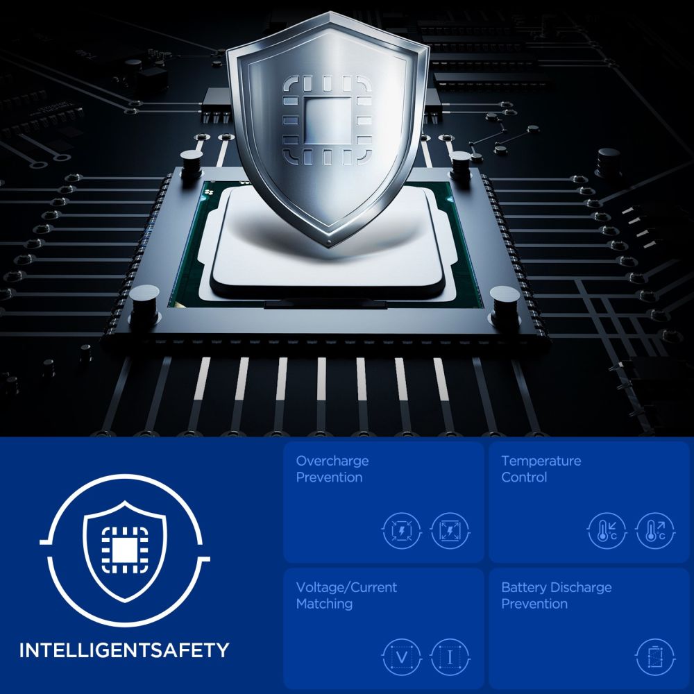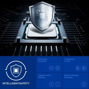 • Intelligens 15 fokozatú biztonsági rendszer: Átfogó védelmet nyújt a túltöltés, túlmelegedés, túlfeszültség, túláram és akkumulátor kisülés ellen (Intelligent Safety).
