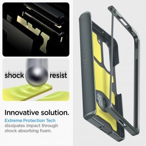 A tok vékony, tökéletesen illeszkedik, teljesen funkcionális és nem korlátozza a hozzáférést a készülék interfészéhez és portjaihoz. A tok belsejében egy technológiai hab formájában készült töltelék található, amely további védelmi réteget biztosít az ütések vagy esések ellen. Minden Spigen terméket az kopásállóság és a pontos illeszkedés szempontjából tesztelnek, hogy magas minőségű tokokat biztosítsanak. A Slim Armor megfelelt az alkalmassági teszteken és megszerezte a MIL STD 810G-516.6 tanúsítványt, ami azt jelenti, hogy 26 alkalommal esett le 2 méter magasból.