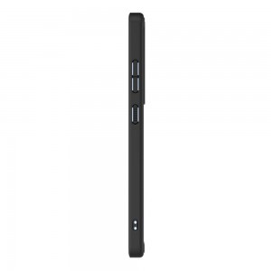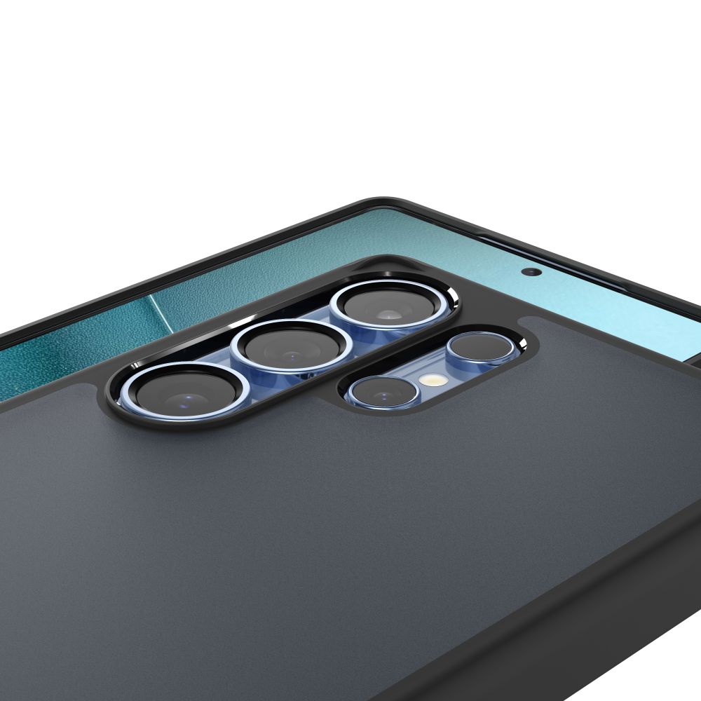 A tok a Spigen jól bevált hibrid technológiáját alkalmazza, amely egy rugalmas, ütéselnyelő TPU (termoplasztikus poliuretán) keretet és egy strapabíró, mattított polikarbonát (PC) hátlapot kombinál. A "Frost Black" kivitel áttetsző, de finoman matt felületével elegánsan engedi átsejlődni a telefonod eredeti színét és dizájnját, miközben hatékonyan gátolja az ujjlenyomatok és a foltok lerakódását. A tok peremén végigfutó, masszív fekete keret stílusos kontrasztot és biztos fogást nyújt.