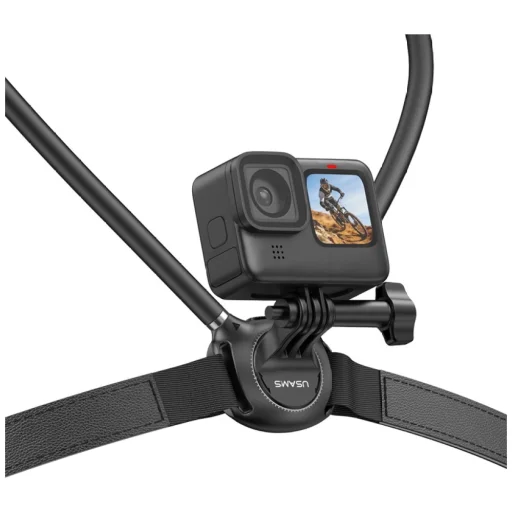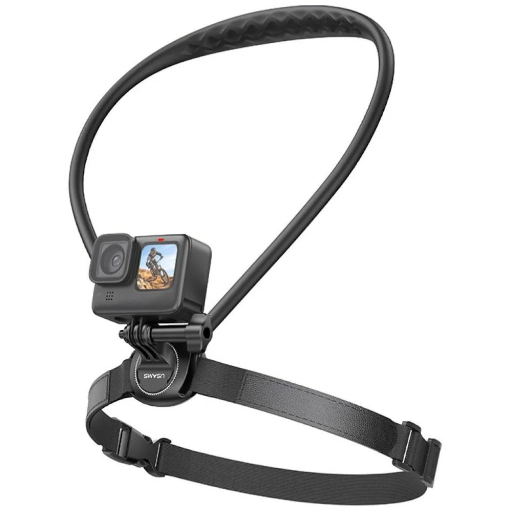 Egy könnyű és kényelmes nyaktartó puha szilikon gallérral biztosítja a kényelmet, az ütéscsillapítást, és lehetővé teszi a kéz nélküli felvételt első személy nézetből. A rugalmas beállítás lehetővé teszi az eszköz könnyű forgatását és a gyors váltást a vízszintes és függőleges felvételek között.