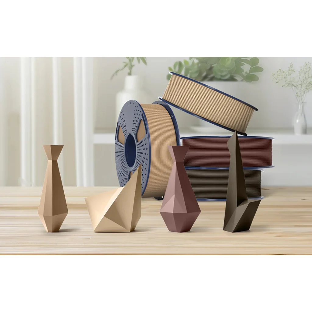 A SUNLU Wood filamentet azok számára tervezték, akik egyedi, dekoratív megjelenést szeretnének adni projektjeiknek, és valódi fához hasonló hatást szeretnének elérni. Az anyag akár 15% valódi faport tartalmaz, így a nyomtatás során természetes, kellemes faillat érezhető, a kész modellek pedig rendkívül hiteles megjelenésűek. Kiváló választás dísztárgyak, figurák, dekorációs elemek, prototípusok és minden olyan nyomtatás készítéséhez, ahol a forma mellett a felület esztétikája is fontos.