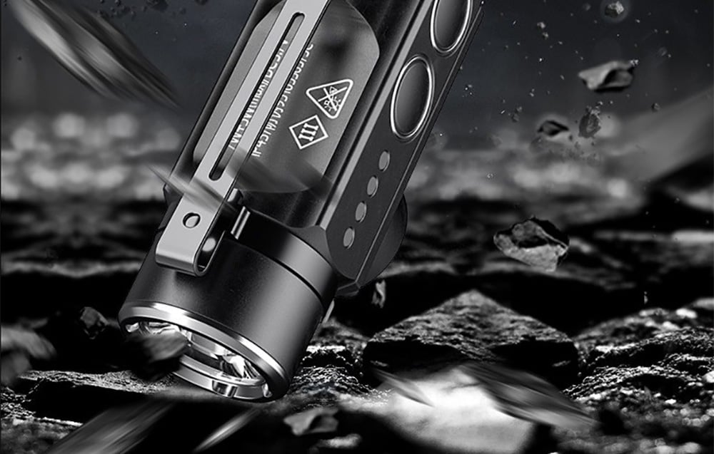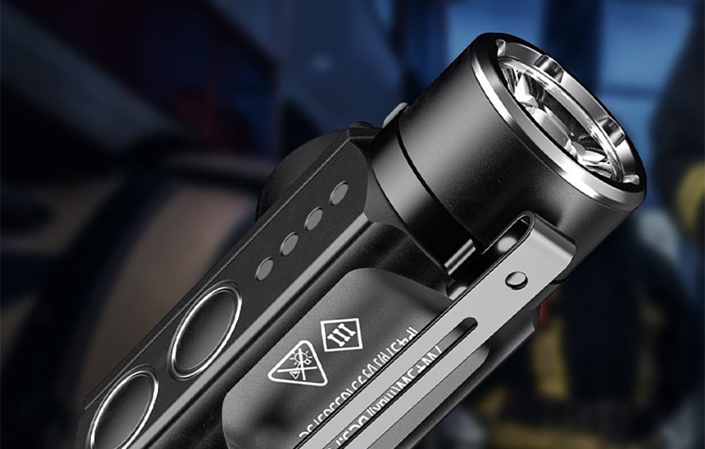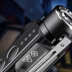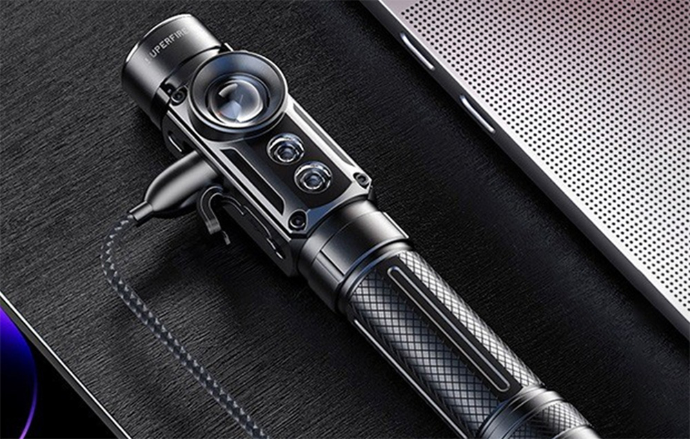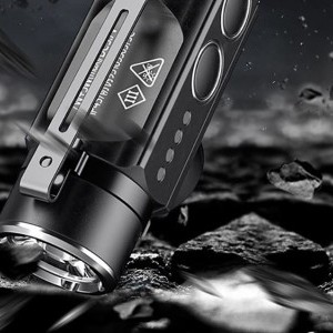 The Superfire J05 offers yellow light, red light, purple light and strobe. You can also adjust the brightness of the main light in 2 levels. These various options make the flashlight usable in a wide range of situations, from precise tasks requiring a strong beam of light to situations requiring more subtle illumination. Each mode can be easily switched using dedicated buttons, making operation of the flashlight intuitive and convenient.