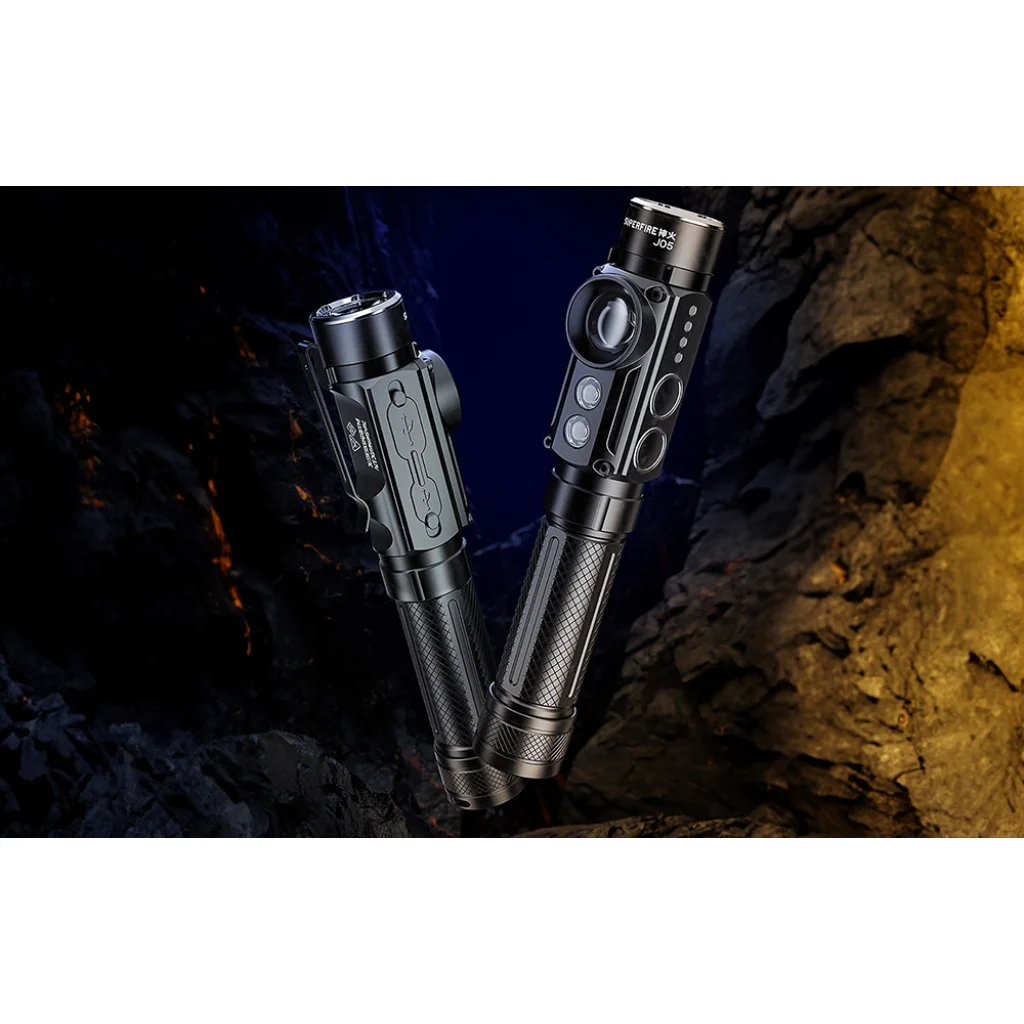 The Superfire J05 offers yellow light, red light, purple light and strobe. You can also adjust the brightness of the main light in 2 levels. These various options make the flashlight usable in a wide range of situations, from precise tasks requiring a strong beam of light to situations requiring more subtle illumination. Each mode can be easily switched using dedicated buttons, making operation of the flashlight intuitive and convenient.