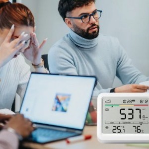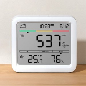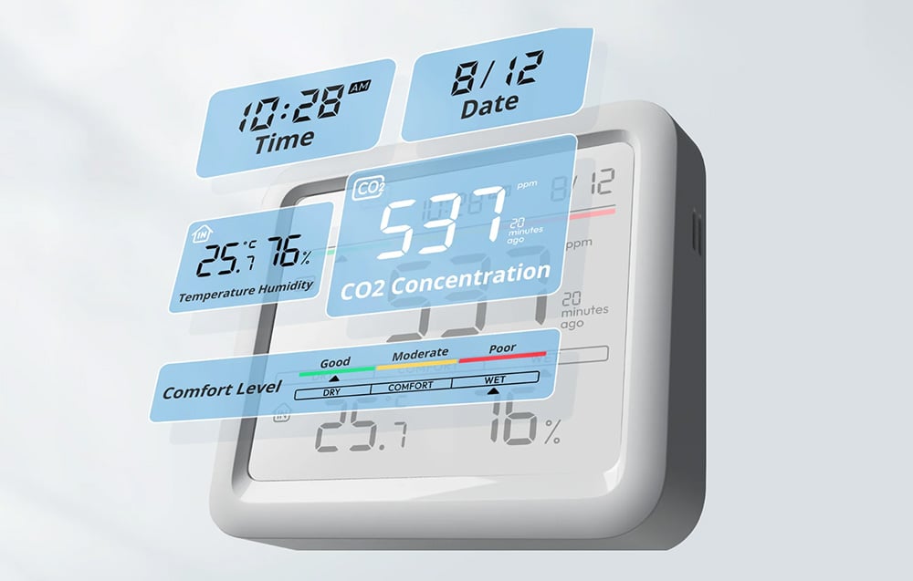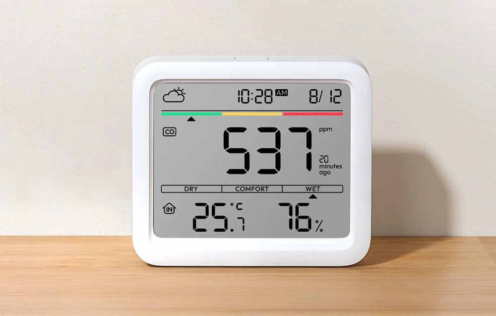 5 érték egy képernyőn Az LCD kijelzőn minden fontos adat elérhető: szén-dioxid (CO₂) szint, hőmérséklet, páratartalom, napszak és általános komfortérzet mutató. Nem szükséges alkalmazásban keresgélnie vagy képernyőt váltania - a szükséges adatok mindig kéznél vannak. Ez különösen előnyös, ahol elengedhetetlen a gyors információhoz jutás, például tárgyalókban, otthoni irodákban és gyerekszobákban.