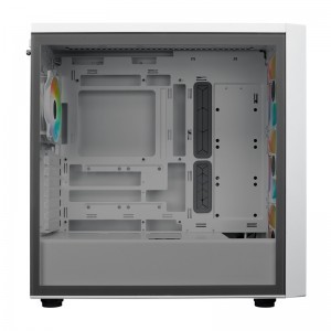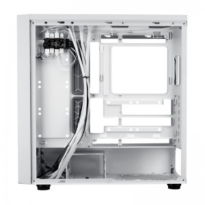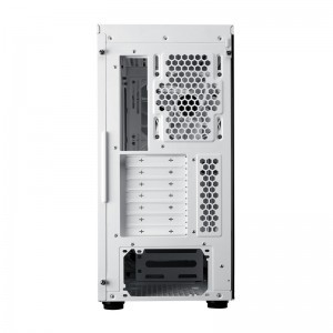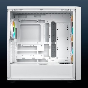 A ház két USB-A 3.2 Gen1 porttal, egy USB-C 3.2 Gen2x2 porttal és egy 3,5 mm-es kombinált csatlakozóval van felszerelve. Így szabadon csatlakoztathatja hozzá a szükséges eszközöket! Emellett az edzett üveg oldallap lehetővé teszi az alkatrészek, például az ARGB háttérvilágítással rendelkező alkatrészek feltárását, az alaplapi tálca mögötti jól átgondolt hely (33-35 mm) pedig megkönnyíti az esztétikus kábelvezetést.