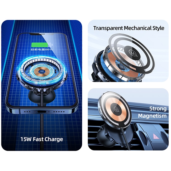 Az USAMS US-CD164 nem csupán funkcionális, hanem lenyűgöző megjelenésű is. Az átlátszó mechanikus stílus bepillantást enged a 9 mm-es réz tekercsbe, amely stabil energiaátvitelt biztosít a készülékhez. Az edzett üveg borítás és az alumíniumötvözet test nem csak a tartósságot garantálja, hanem modern és futurisztikus megjelenést is kölcsönöz. A 16 erős mágnes szilárdan a helyén tartja telefonját, megakadályozva annak elmozdulását menet közben, így nyugodtan koncentrálhat a vezetésre.