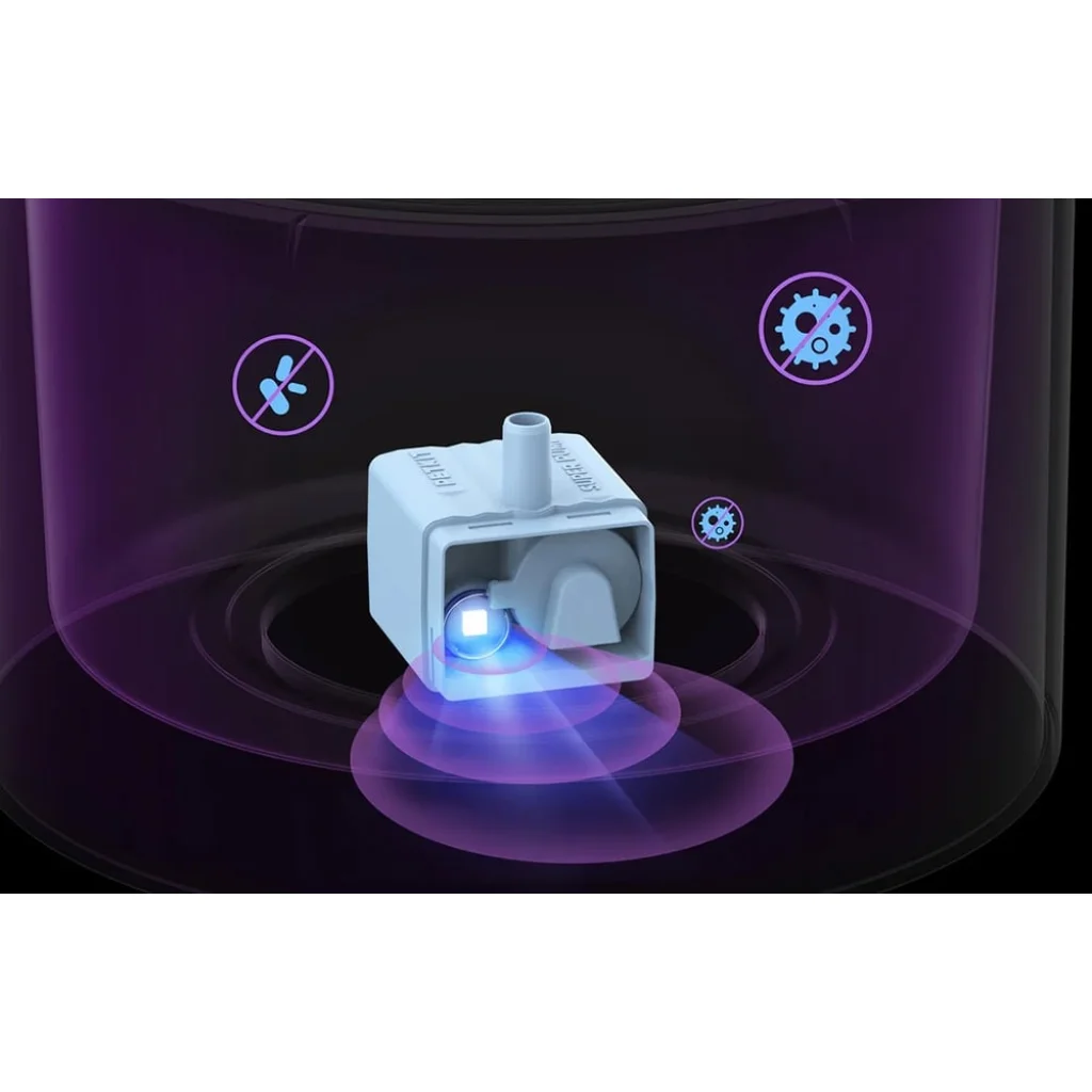 Gondoskodjon kedvence egészségéről a Petkit Eversweet FFT1 szivattyú innovatív sterilizálási technológiájával. A készülék által kibocsátott rövidhullámú ultraibolya fény a káros baktériumok, mint például az Escherichia coli, akár 99,96%-át is eltávolítja, hatékonyan tisztítva a vizet. Ez a megbízható megoldás minden nap higiénikus körülményeket és biztonságos ivóvizet garantál.