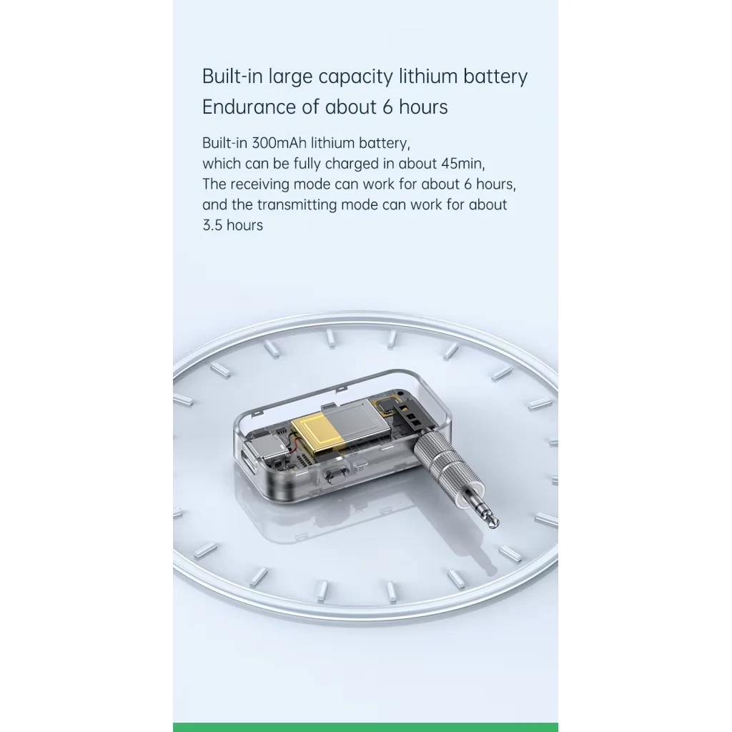 - Hosszú akkumulátor-üzemidő és gyorstöltés: A beépített 300mAh-s lítium akkumulátor RX módban akár 6 óra, TX módban pedig körülbelül 3.5 óra folyamatos működést tesz lehetővé. Teljesen feltölthető mindössze kb. 45 perc alatt.