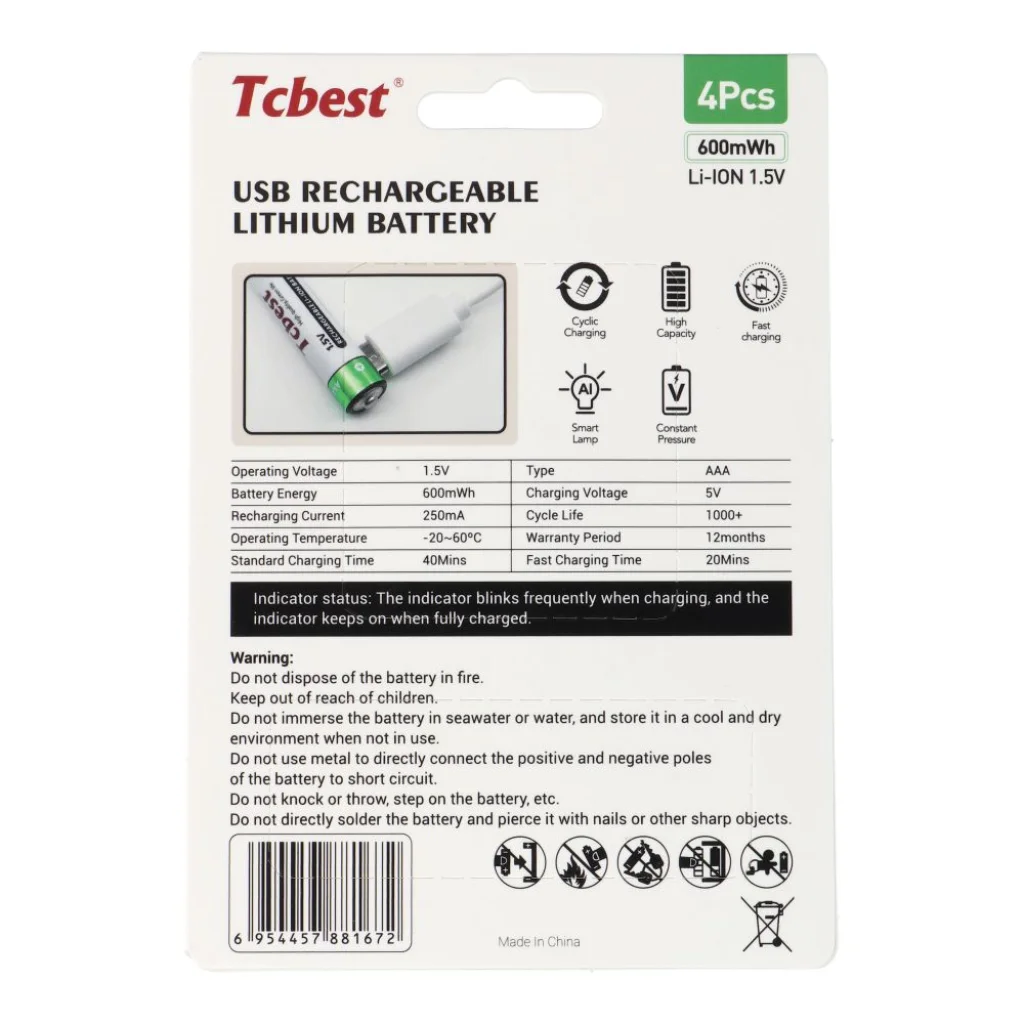 A TCBEST modern AAA tölthető elemeket kínál 180 mAh kapacitással, tökéletes játékokhoz, távirányítókhoz, elemlámpákhoz és más mindennapi eszközökhöz. A beépített USB-C port lehetővé teszi az egyszerű töltést további töltő nélkül, kényelmet és költségmegtakarítást biztosítva. Ezek az elemek hosszú élettartamra lettek tervezve, és többször újratölthetőek, így környezetbarát és gazdaságos alternatívát jelentenek az eldobható elemekkel szemben. A mellékelt USB-A - 4 x USB-C kábel lehetővé teszi mind a négy elem egyidejű töltését, növelve a felhasználói kényelmet. A csomag tartalma: 4x TCBEST AAA 180 mAh elem USB-C porttal, USB-A - 4 x USB-C töltőkábel.