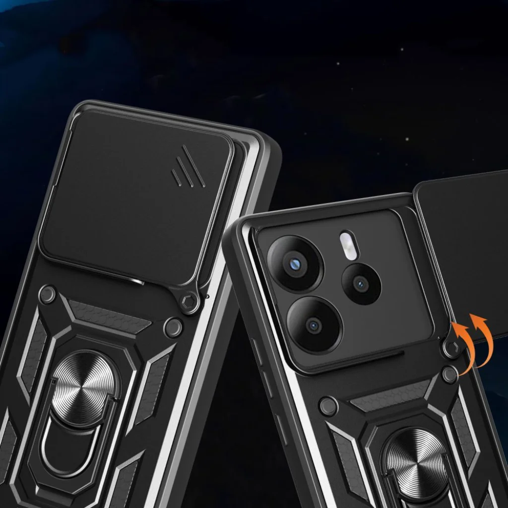 Kényelmes és könnyen használható csúszkával van felszerelve, amely bármikor elrejthető. A praktikus fedél megvédi a kamerát a váratlan sérülésektől. A 360 fokban forgatható gyűrű tökéletes állványként szolgálhat filmek nézéséhez, ujjgyűrűként a telefon biztonságos kézben tartásához, sőt, még mágneses autós tartóra való rögzítésként is.