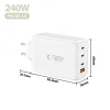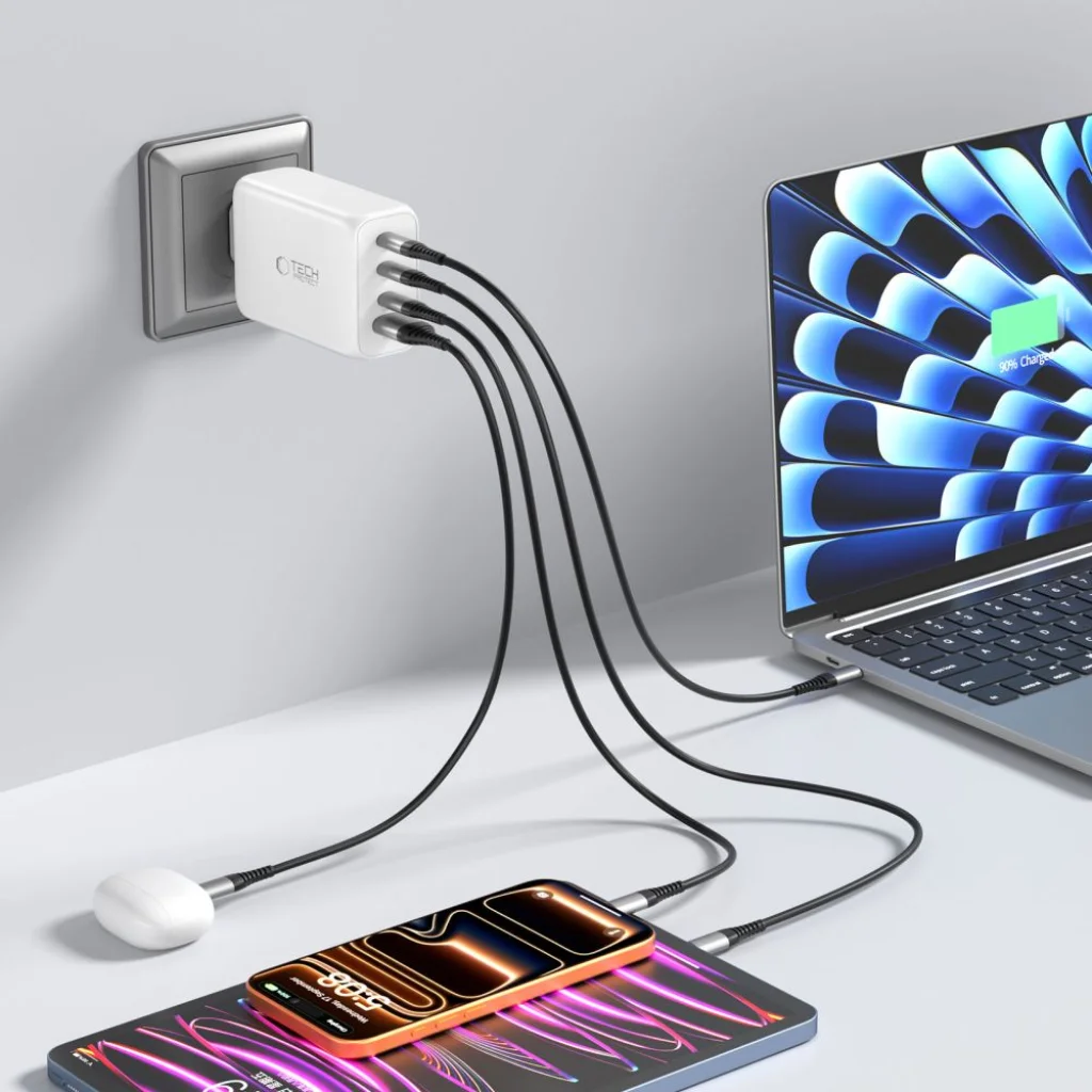 A Tech-Protect NC240W-GAN hálózati töltő egy fejlett eszköz, amely a GaN (gallium-nitrid) technológiát alkalmazza, 240W teljesítményt kínál egy kompakt házban. Négy töltőportjának köszönhetően egyszerre akár laptopot, tabletet, okostelefont és további kiegészítőket is tölthetsz maximális hatékonysággal. A töltő három Type-C és egy USB-A porttal van felszerelve, amelyek nagy rugalmasságot biztosítanak a mindennapi használat során. Az elsődleges Type-C1 port 140W teljesítményt nyújt 28V feszültséggel, ami kiválóan alkalmas MacBookok Pro 16" és más nagy teljesítményű laptopok töltésére. A második Type-C2 port 100W, a harmadik Type-C3 port 65W, míg az USB-A port 60W teljesítményt biztosít Super Charge támogatással. Mind a négy port egyszerre is használható intelligens teljesítményelosztással. A Power Delivery és a Quick Charge 3.0 technológia automatikusan felismeri a csatlakoztatott eszközöket, és az igényeiknek megfelelően állítja be a töltési paramétereket. A minimalista ház elegáns megjelenést kölcsönöz az íróasztalon, míg a kompakt méretek kényelmessé teszik az otthoni, irodai vagy utazási használata során. A Tech-Protect NC240W-GAN egy praktikus megoldás azok számára, akik több eszközzel dolgoznak, és megbízható töltőállomásra van szükségük.