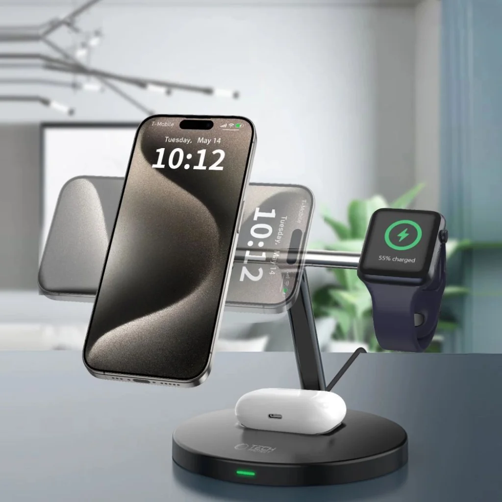 A Tech-Protect A35 multifunkciós induktív töltő lehetővé teszi három eszköz egyidejű vagy teljesen külön töltését - iPhone MagSafe funkcióval, AirPods és Apple Watch. Az egyszerű, de funkcionális kialakítás visszafogott színekben nagyon esztétikus megjelenést kölcsönöz neki. A moduláris kialakításnak köszönhetően az eszközeinket különböző konfigurációkban tölthetjük.