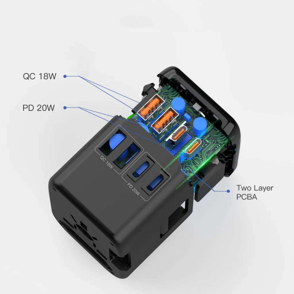 A Tech-Protect TA200 utazó adapter egy univerzális adapter, amely lehetővé teszi az elektronikus eszközök használatát több mint 150 országban világszerte. Beépített EU, UK, USA és AU csatlakozói, valamint kompakt kialakítása miatt tökéletesen alkalmas turisztikai és üzleti utazásokra. Az adapter négy USB porttal van felszerelve: két USB-A gyors töltési technológiával QC 3.0 (18 W) és két USB-C port Power Delivery (20 W) támogatással, lehetővé téve négy eszköz egyidejű töltését. A beépített biztonsági rendszer védi a túlmelegedés, túlterhelés és rövidzárlat ellen, valamint a két rétegű PCB stabil és biztonságos működést biztosít. Az adapter rendelkezik kihúzható csatlakozókkal, amelyeket könnyen lehet váltani további eszközök használata nélkül. Kompakt, könnyű kialakítása és tartós kivitelezése elengedhetetlenné teszi minden utazó számára.