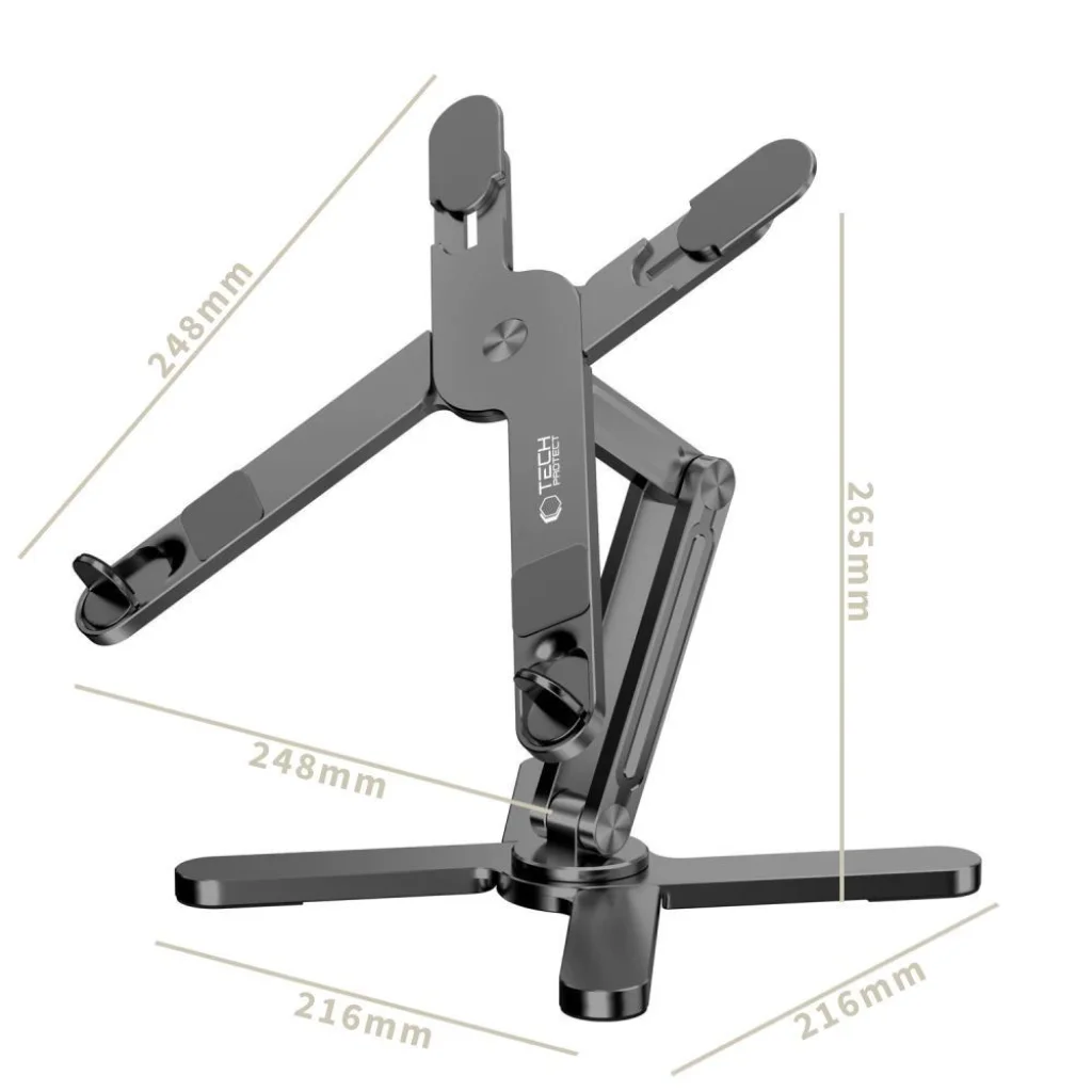 A Tech-Protect ULS200 állvány egy modern, multifunkcionális asztali kiegészítő, amely elektronikus eszközök, például laptopok támogatására lett tervezve. Magas minőségű alumíniumból készült, ami biztosítja annak tartósságát és stabilitását. Állítható karokkal rendelkezik, amelyek alkalmazkodni tudnak különböző méretű és pozíciójú eszközökhöz.