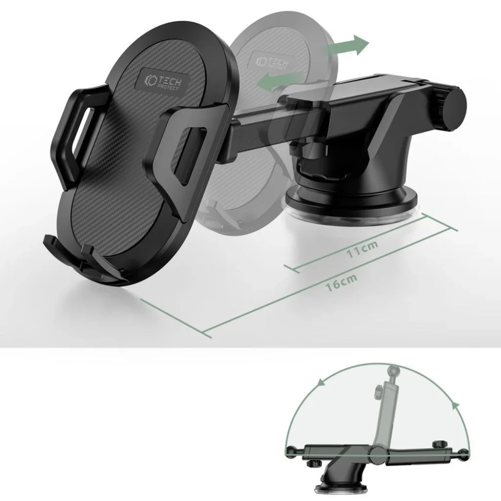 Egy univerzális és rendkívül stabil autós tartó, amely minden standard funkcióval rendelkezik, és biztonságos és funkcionális megoldást kínál minden okostelefon számára. A tartó egy új, kétlépcsős karral van felszerelve, amely lehetővé teszi a tartó rögzítését bárhova a szélvédőn, és a erős gél tapadókorongnak köszönhetően a legtöbb műszerfalra is. A Tech-Protect univerzális autós tartó teleszkópos karral rendelkezik, hogy a felhasználók még több lehetőséget kapjanak az okostelefonjaik megtekintésére és használatára vezetés közben. A telepítése rendkívül egyszerű: csak zsírtalanítani kell azt a helyet, ahova a tartót ragasztani szeretnénk, meghúzni a kart, és kész! A tapadókorong tapadóképességének megőrzése érdekében újratelepítés előtt mossa meg folyó víz alatt.