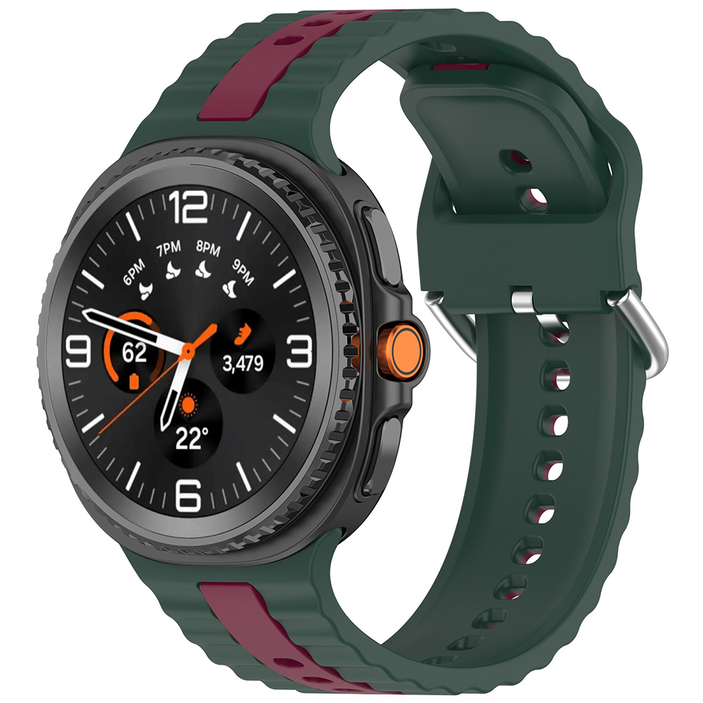 Az óraszíj az "Éjféli Smaragd" (mélyzöld) alapszínnel hódít, melyet elegánsan egészít ki egy kontrasztos, borvörös vagy burgundi sáv a közepén. Ez a két tónusú kialakítás modern és figyelemfelkeltő megjelenést biztosít. A szíj külső szélein végigfutó egyedi, hullámos textúra nemcsak esztétikus, hanem hozzájárul a kényelmes viselethez is, egyedi tapintást kölcsönözve neki.