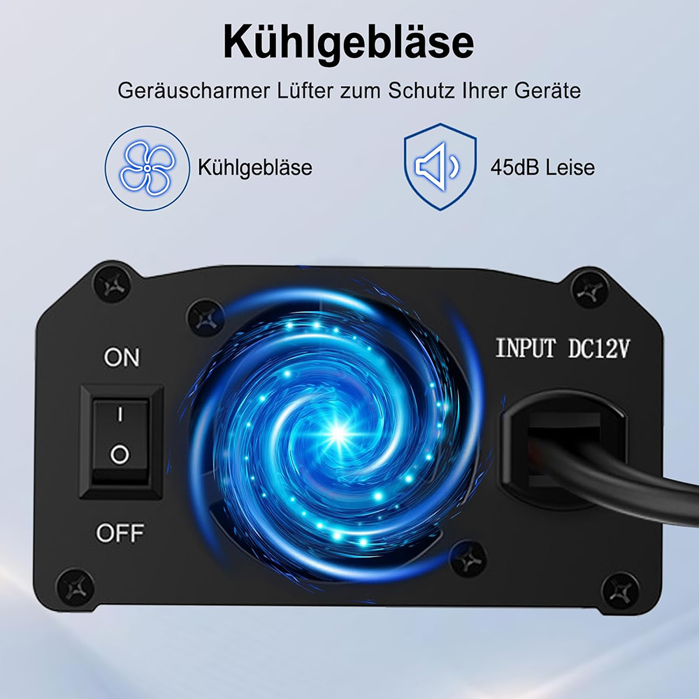 Az inverter beépített intelligens hűtőventilátorral rendelkezik, amely automatikusan szabályozza a fordulatszámát a belső hőmérséklet függvényében. Alacsonyabb hőmérsékleten (kb. 45°C) alacsony sebességgel, magasabb hőmérsékleten (kb. 60°C) pedig magasabb sebességgel működik, biztosítva az optimális hőelvezetést. Ez a halk (max. 45dB) működés garantálja a készülék hosszú élettartamát és a zavartalan használatot, anélkül, hogy zavarná az utazás élményét.