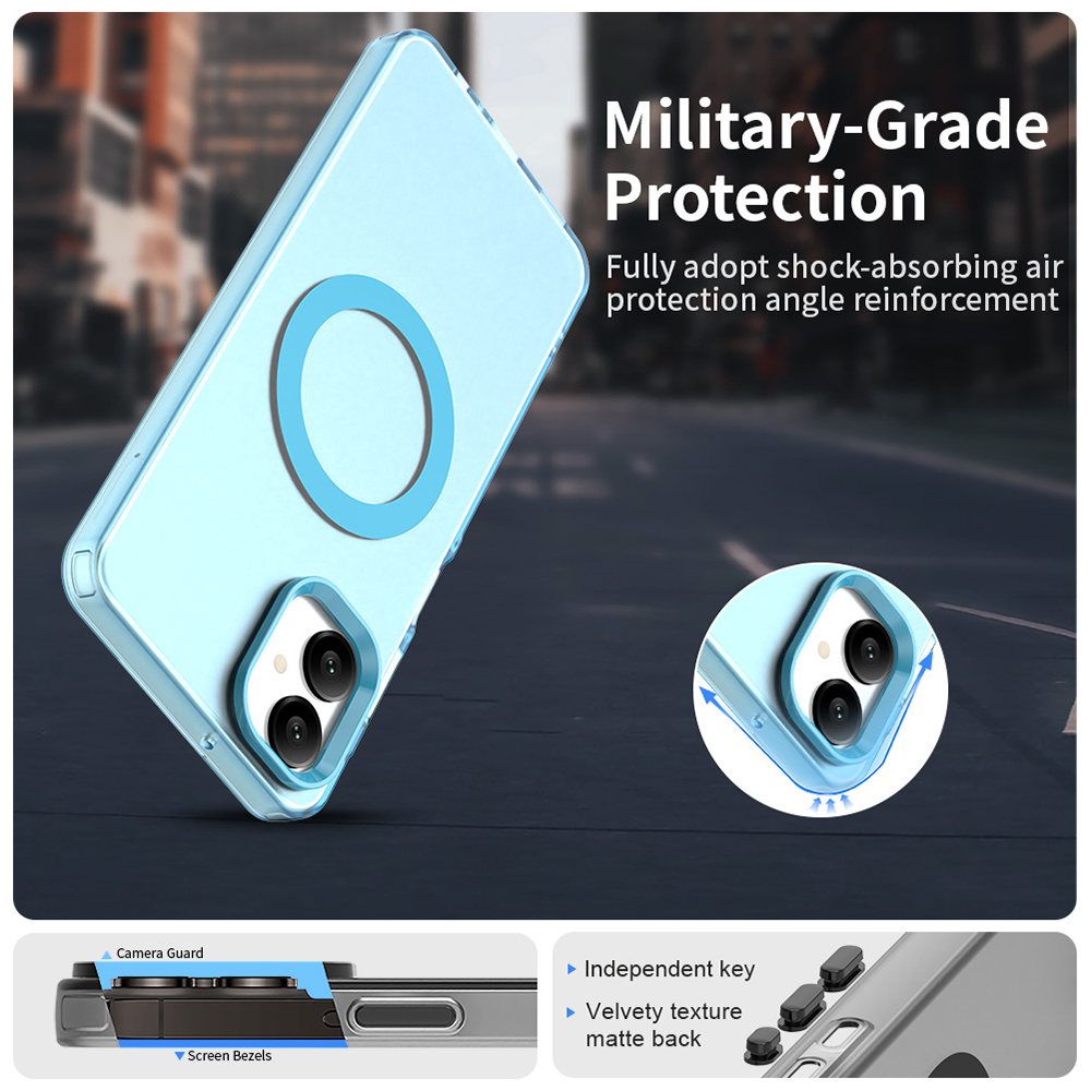 A CandyCase MagSafe tok importált ujjlenyomat-gátló bevonattal rendelkezik, amely hosszú távon frissen és tisztán tartja telefonját. A kiváló minőségű anyagok és a letisztult, minimalista design tökéletesen illeszkedik a Samsung Galaxy A06 telefonhoz, megőrizve annak eredeti szépségét. A finom, matt tapintású hátlap (velvety texture) tovább növeli a prémium érzetet, miközben áttetsző kékségével kiemeli készülékét.