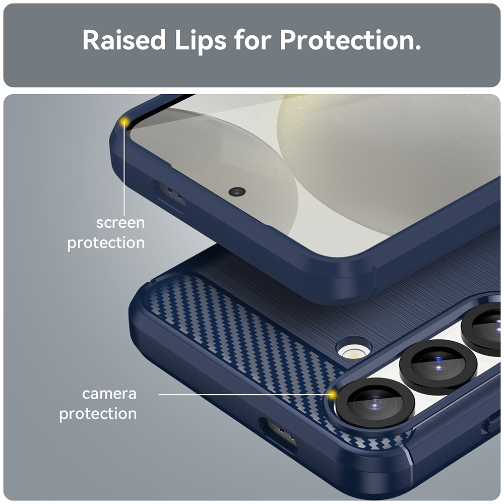 Ez a kék színű tok egyedülálló esztétikát kínál a modern szálcsiszolt textúra és a letisztult karbon mintázat kombinációjával. A felső és alsó részen található karbon mintázat sportos, mégis elegáns megjelenést kölcsönöz, míg a középen futó szálcsiszolt felület kifinomult jelleggel ruházza fel készülékedet.
