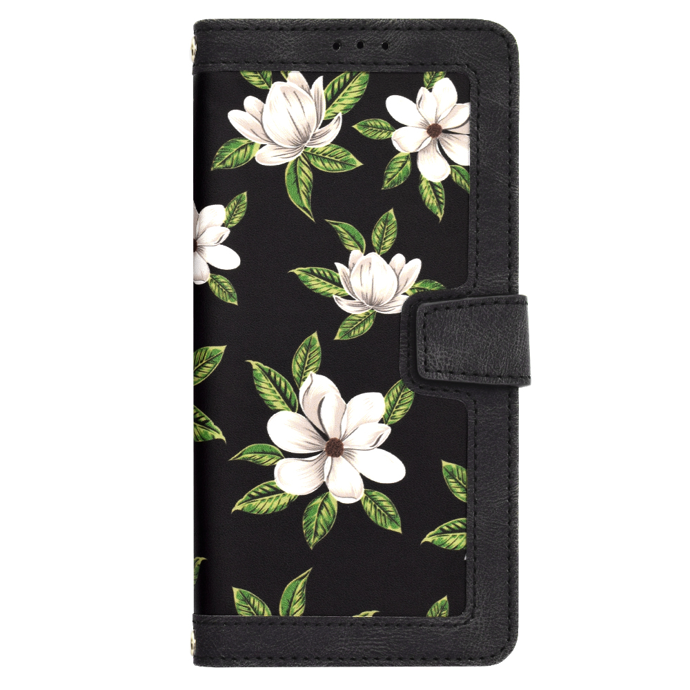A tok elegáns fekete alapszínét egy mesés, részletgazdag virágmintázat díszíti: fehér magnólia-szerű virágok vibráló zöld levelekkel. Ez a "Hajnal Virágai" elnevezésű minta minden tekintetet magára vonz, és kifinomult eleganciát sugároz. A külső borítás kiváló minőségű, strapabíró műbőrből (PU bőr) készült, amely kellemes tapintású és ellenáll a mindennapi kopásnak és karcolásoknak. Belül egy rugalmas, puha TPU/szilikon keret biztosítja a telefon stabil rögzítését, elnyelve az esetleges ütéseket.