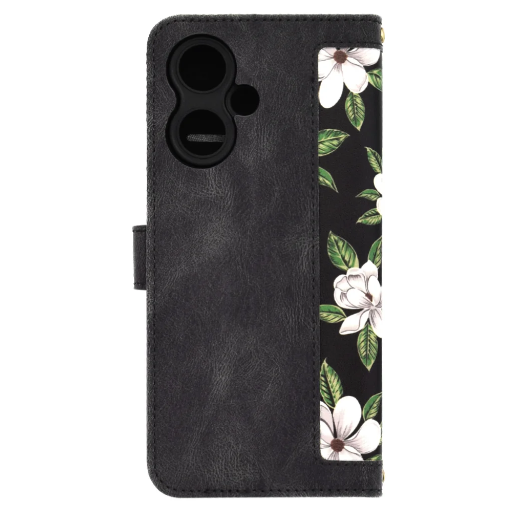 Merüljön el a természet ihlette szépségben! A tok matt fekete alapját lélegzetelállító, kézzel rajzolt hatású, fehér magnóliavirágok díszítik, élénkzöld levelekkel kiegészítve. Ez az aprólékosan kidolgozott virágminta egy csipetnyi eleganciát és frissességet kölcsönöz készülékének, kiemelve azt a tömegből. A dizájn mind a tok külső, mind a belső, látható felületén megjelenik, egységes és lenyűgöző megjelenést biztosítva.