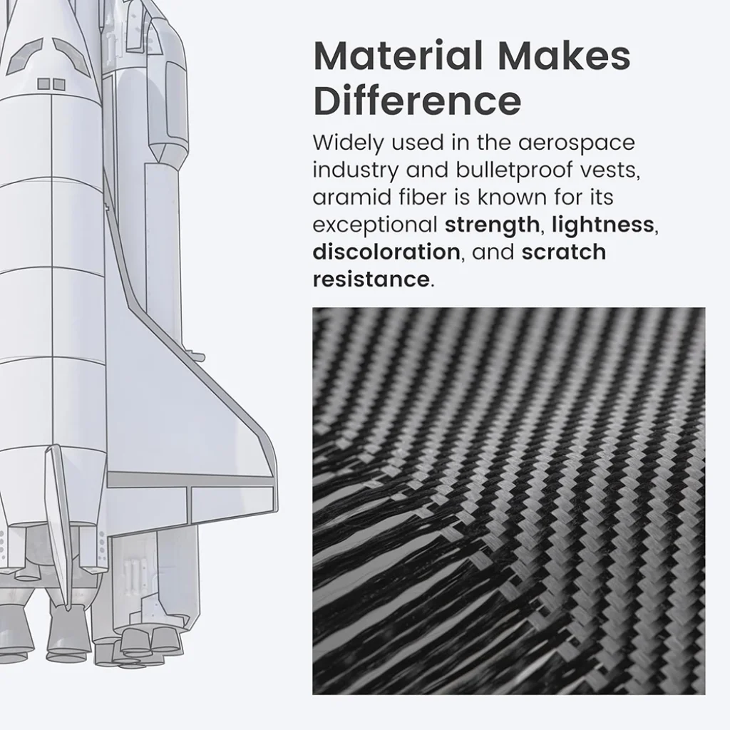 Az űrtechnológiában és golyóálló mellényekben is használt aramid szál a kivételes erő, hihetetlen könnyedség, elszíneződés- és karcállóság szinonimája. A Techsuit tok ezzel az innovatív anyaggal készült, garantálva, hogy iPhone 14-e a mindennapok során a lehető legjobb védelmet élvezze anélkül, hogy feleslegesen nehezebbé vagy terjedelmesebbé válna.