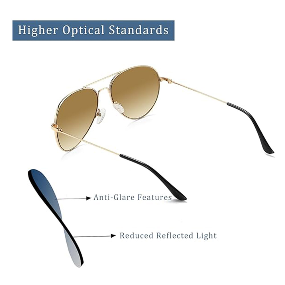 Fedezze fel a Techsuit 3025 unisex napszemüveget, amely tökéletesen ötvözi az ikonikus aviátor stílust a modern optikai technológiával. Az elegáns arany színű fémkeret és a klasszikus barna, átmenetes lencsék időtlen megjelenést kölcsönöznek, miközben a legmagasabb szintű védelmet és vizuális kényelmet biztosítják.
