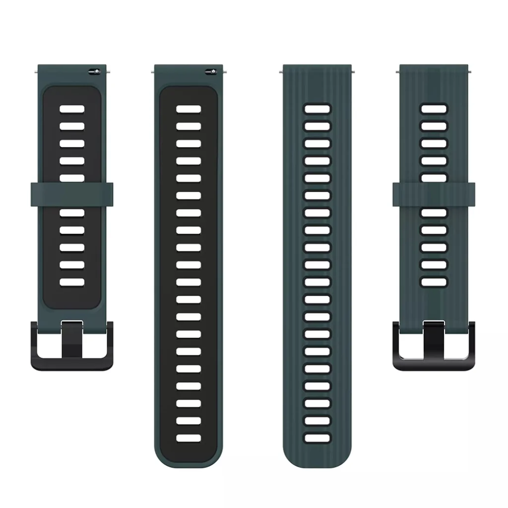 - Sportos és egyedi design: A mélyzöld külső réteg és a kontrasztos, fekete belső felület modern és dinamikus megjelenést kölcsönöz. A szíj felületén található finom, bordázott textúra nemcsak esztétikus, hanem segíti a légáteresztést is, növelve a komfortérzetet sportolás közben.