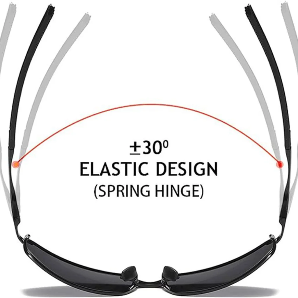 - Rugalmas rugós zsanérok: Az innovatív rugós zsanér mechanizmus nem csak simább nyitást és zárást tesz lehetővé, hanem növeli a szemüveg tartósságát is. Az ±30°-os rugalmas kialakításnak köszönhetően a szár tökéletesen illeszkedik különböző arcformákhoz, még kényelmesebbé téve a viseletet.