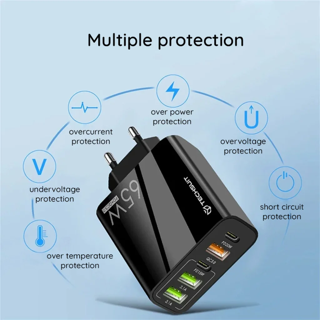 Élvezze a felülmúlhatatlan töltési élményt a Techsuit PentaXPower (CHC2) prémium fali töltővel! Ez a csúcstechnológiás, 65W-os összteljesítményű töltő a modern életstílus minden kihívására választ ad, lehetővé téve, hogy egyszerre több eszközét is gyorsan és biztonságosan töltse.