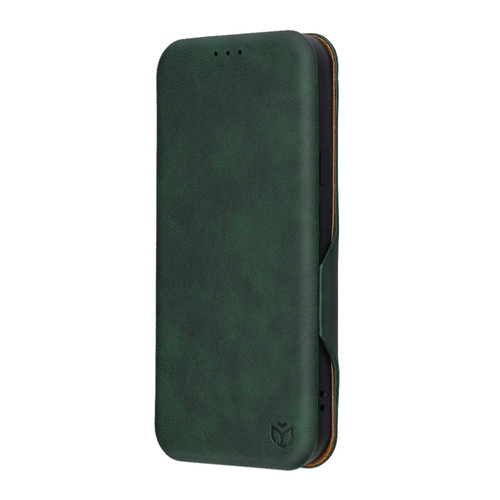 Ez a Techsuit tok strapabíró, mégis kellemes tapintású műbőrből készült, amely hosszú távú védelmet nyújt telefonjának. A mélyzöld külső felület enyhén antikolt hatású, ami elegáns megjelenést kölcsönöz, míg a belső, melegbarna színű bélés kontrasztos, exkluzív hatást kelt. A pontos kidolgozás és a Techsuit logó finoman hangsúlyozza a termék prémium minőségét.