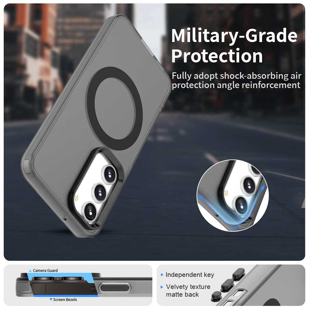 • Az integrált, erős MagSafe gyűrű kivételes tapadást biztosít, lehetővé téve a MagSafe kompatibilis kiegészítők (például vezeték nélküli töltők, mágneses pénztárcák vagy telefontartók) biztonságos és stabil rögzítését.