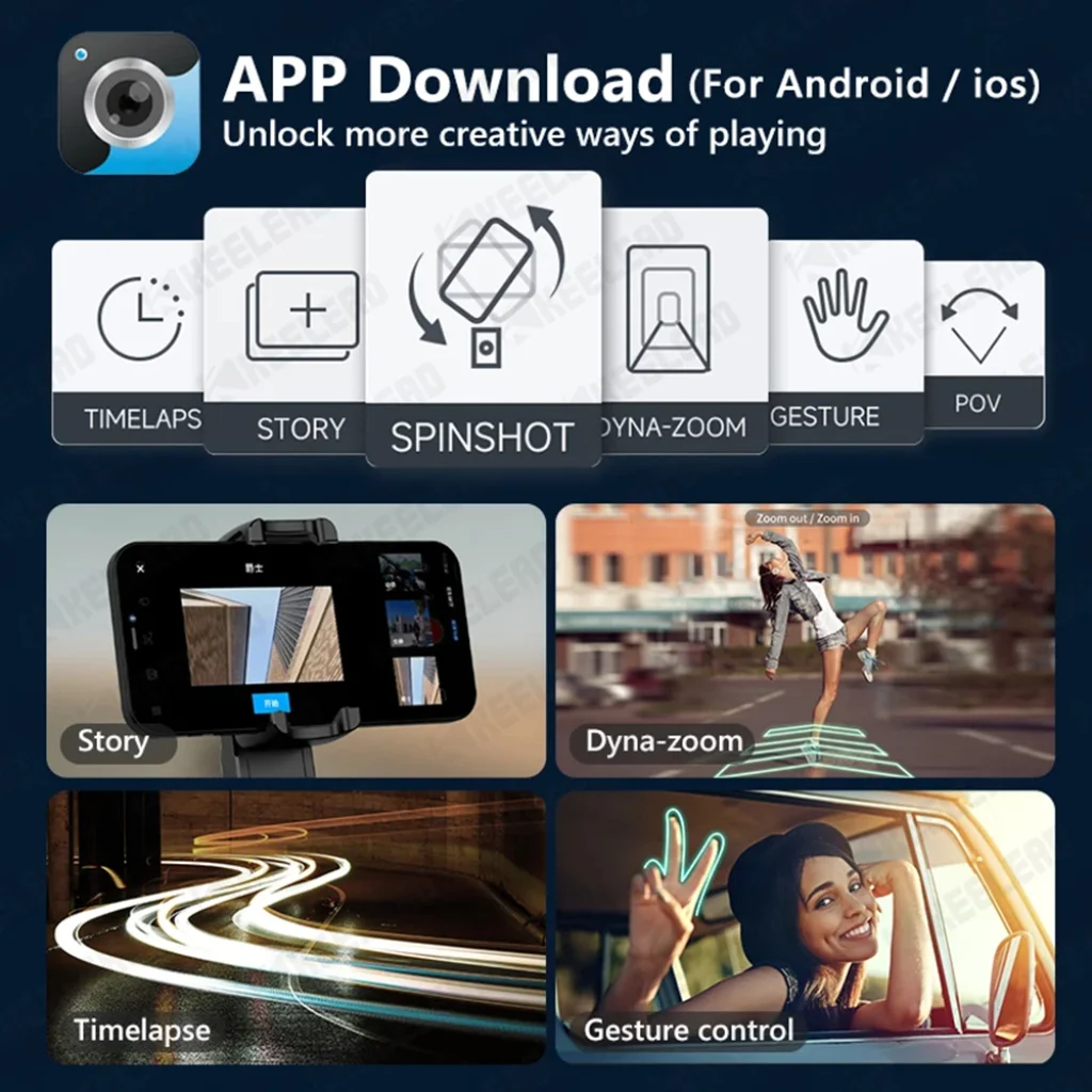 - A levehető Bluetooth távirányítóval kényelmesen irányíthatod a felvételeidet akár távolról is. Indíts/állíts meg videót, készíts fotókat, válts módokat (pl. POV mód, fotó/videó mód) és szabályozd a 360°-os forgatást egyetlen gombnyomással.
