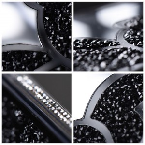 - Kifinomult oldalsó díszítés: A tok oldalsó, átlátszó keretét apró, csillogó, áttetsző kristályok díszítik, amelyek finom csillogással egészítik ki a hátlap ragyogását, és harmonikus összképet alkotnak.