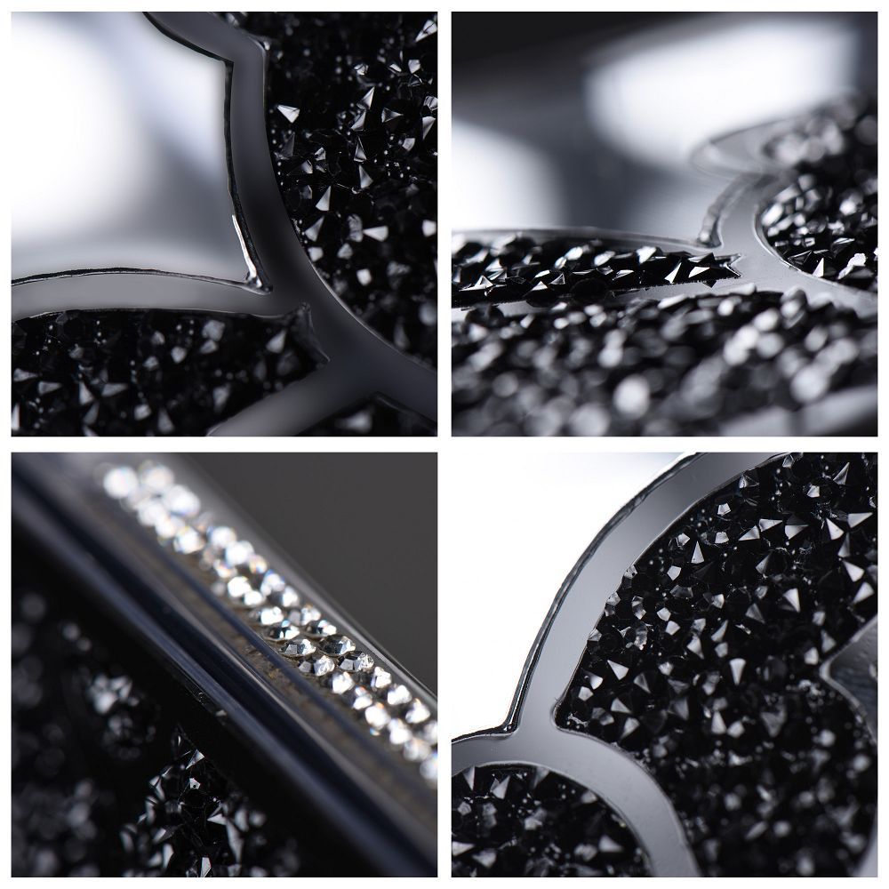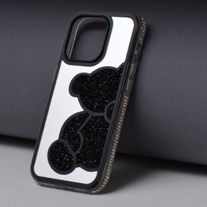 - Exkluzív dizájn: A tok hátoldalán egy elegáns, tükörhatású, ezüstös felület található, melyen stílusosan helyezkedik el a jellegzetes, csillogó fekete kristályokkal kirakott maciminta. Ezek a gondosan illesztett apró kövek lenyűgöző, texturált felületet és kifinomult ragyogást kölcsönöznek a maci alakjának.