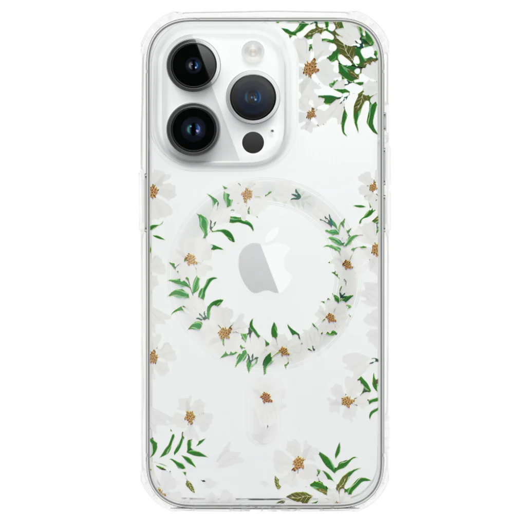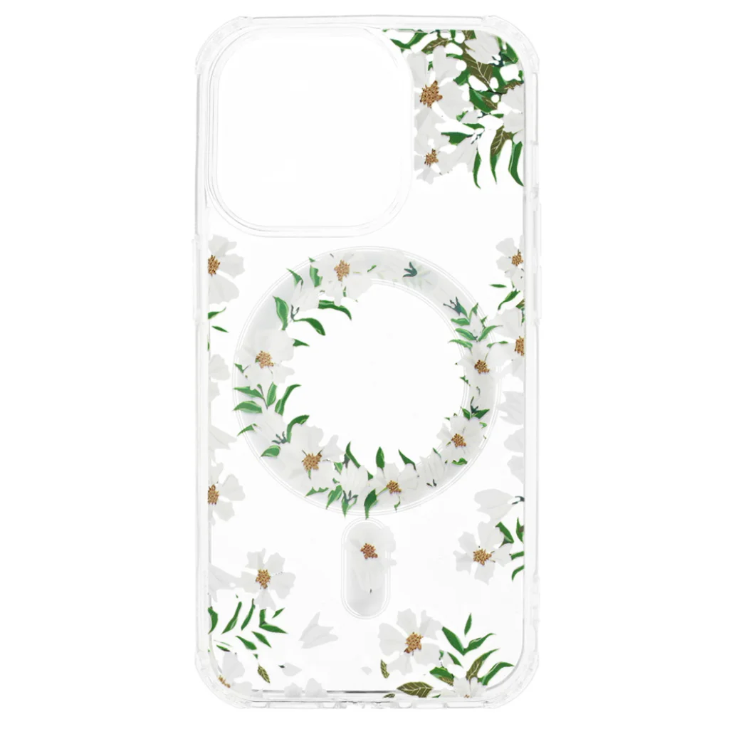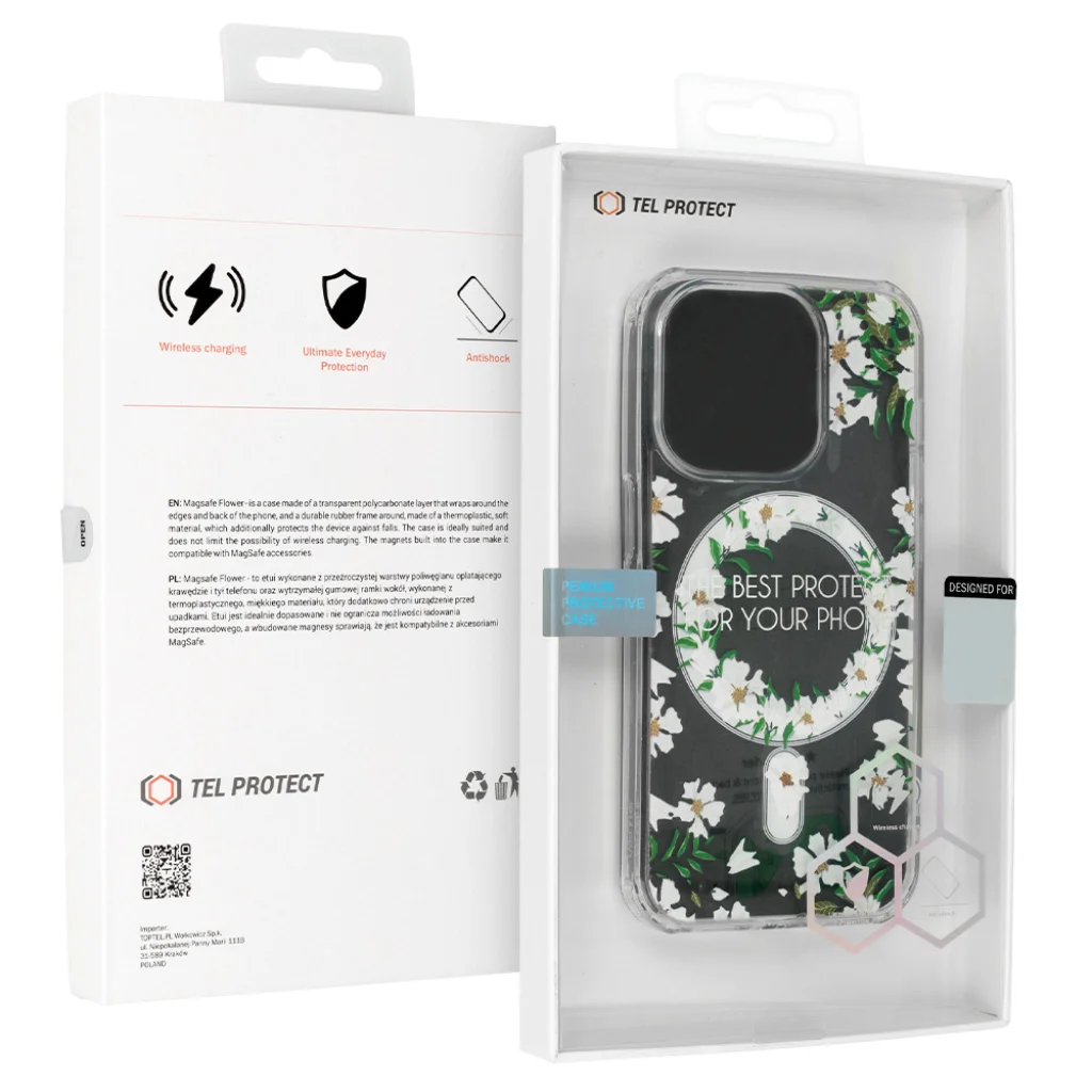 Tel Protect Flower Magsafe - egy átlátszó tok, amelyet egyedi virágmintával díszítettek. A tok védi az okostelefon hátulját, oldalait és képernyőjét. A tokba beépített mágnesek kompatibilissé teszik az Apple MagSafe tartozékokkal.