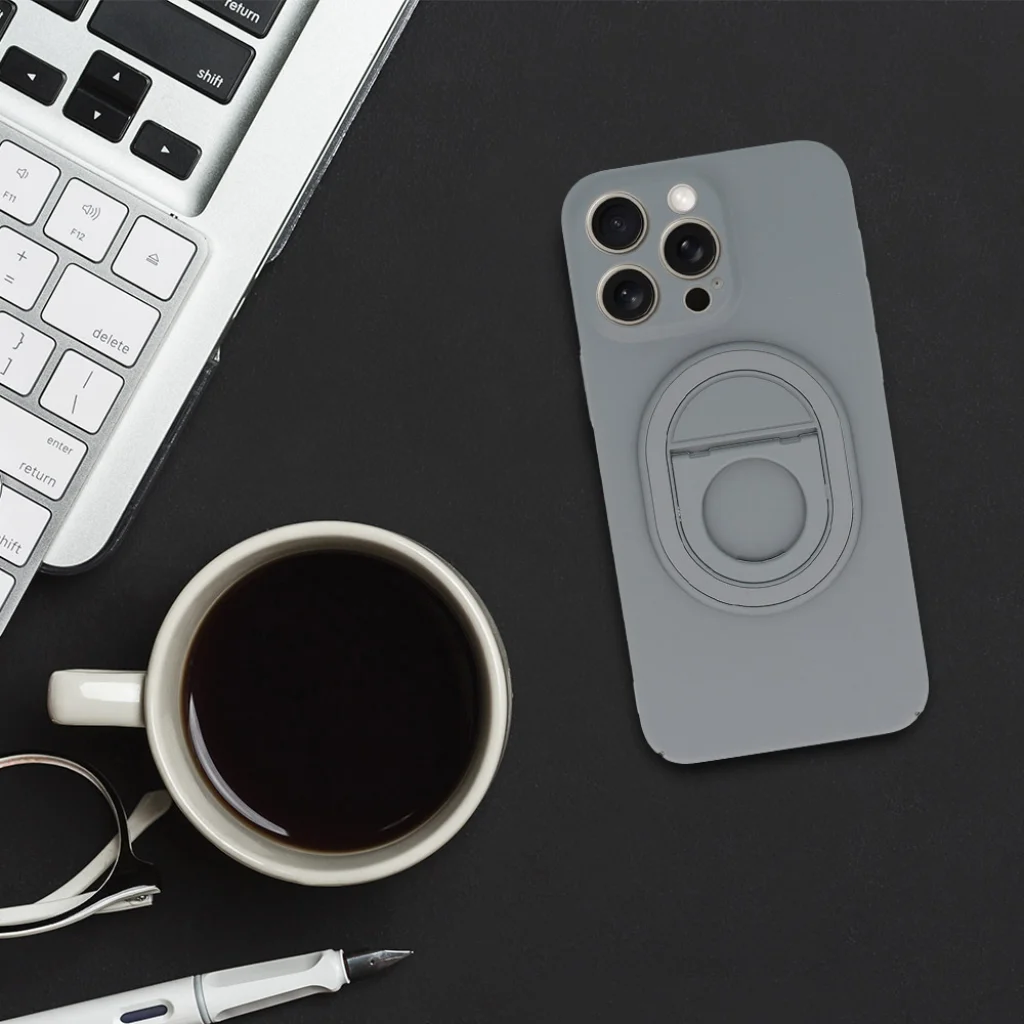 - Praktikus beépített gyűrűvel van ellátva, amely egyaránt funkcionál tartóként és állványként, lehetővé téve a telefon szabad használatát függőlegesen és vízszintesen is