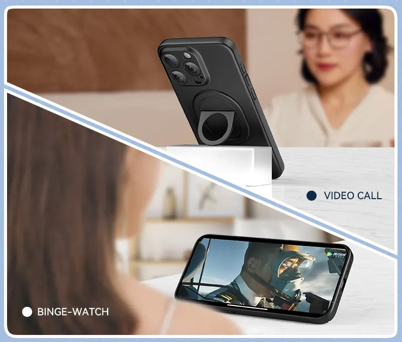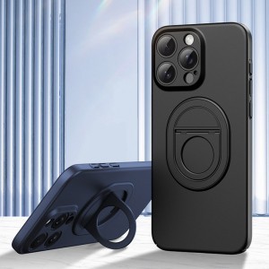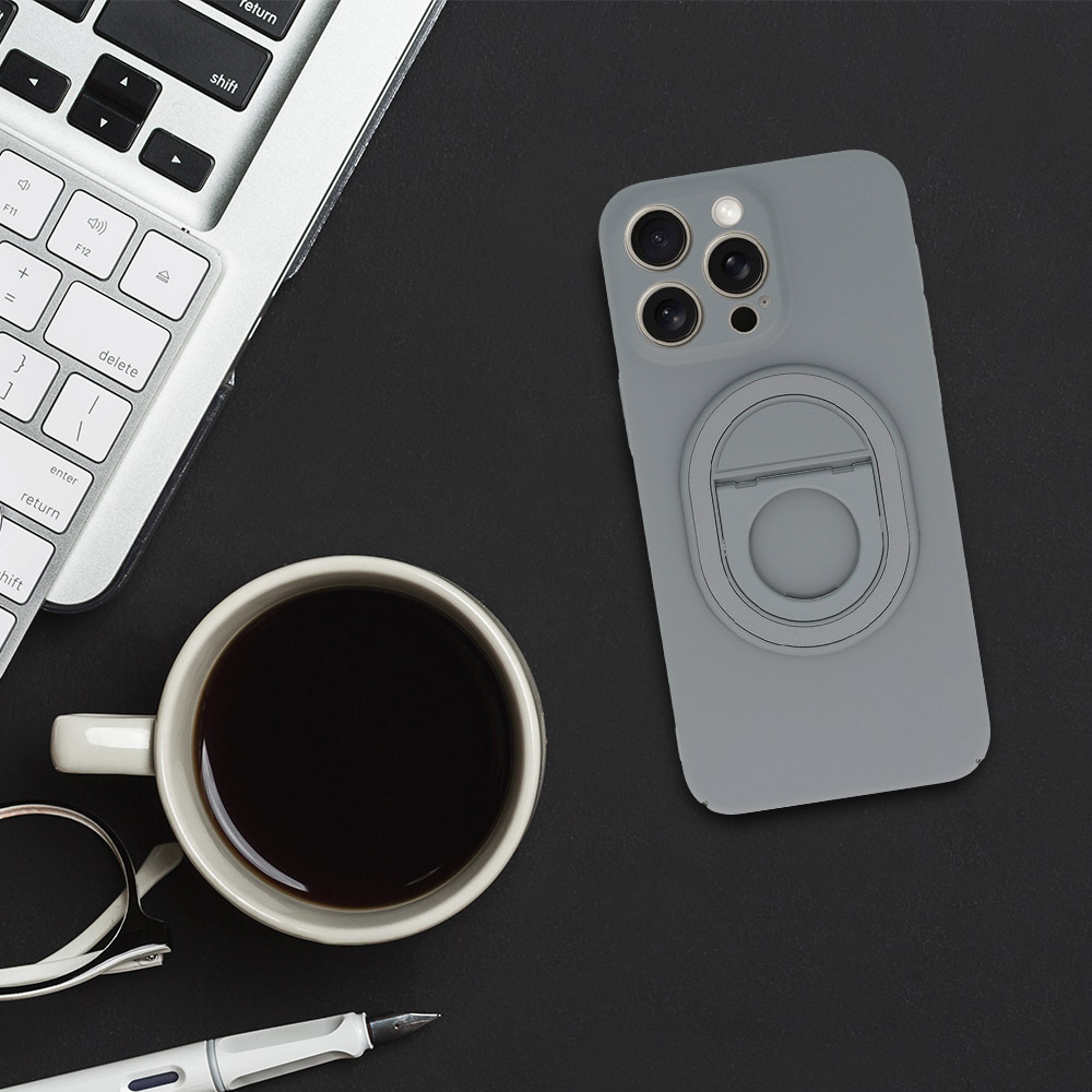 - Praktikus beépített gyűrűvel, amely tartóként és állványként is szolgál, lehetővé téve a telefon szabad használatát függőlegesen és vízszintesen is